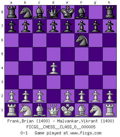 Last move : 0-1 2006 July 13 13:36:33 [Event "FICGS__CHESS__CLASS_D__000005"] [Site "FICGS"] [Date "2006.06.01"] [Round "1"] [White "Frank,Brian"] [Black "Malvankar,Vikrant"] [Result "0-1"] [WhiteElo "1400"] [BlackElo "1400"] 1.d4 Nf6 0-1 This chess game has been lost on time (started : 2006.06.01 14:40:57) Queen's pawn game Player Black won this chess game. Follow this game move after move (download)Bobby Fischer's current state of mind is indeed a tragedy. One of the world's greatest Chess players - the pride and sorrow of American Chess. (Frank Brady) Im Hotelzimmer gab es nur zwei Schaben. (Über die Turnierbedingungen) (Peter Swidler) Cuando la partida de Ajedrez termina, el Peón y el Rey regresan a la misma caja. (Irish saying) Les ravages du H expliquent la différence de niveau entre Tal et Thal [Abergel]. The only thing that matters is the evidence. (Horatio Caine, C.S.I. Miami)