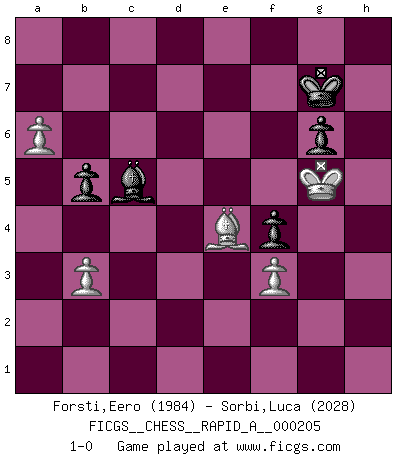 Last move : 1-0 2018 April 24 23:40:12 [Event "FICGS__CHESS__RAPID_A__000205"] [Site "FICGS"] [Date "2017.11.30"] [Round "1"] [White "Forsti,Eero"] [Black "Sorbi,Luca"] [Result "1-0"] [WhiteElo "1984"] [BlackElo "2028"] 1.Nf3 Nf6 2.g3 d5 3.Bg2 c6 4.O-O Bg4 5.d3 Nbd7 6.Nbd2 e5 7.e4 dxe4 8.dxe4 Bc5 9.h3 Bh5 10.Qe1 O-O 11.a4 Re8 12.Nb3 Bf8 13.Nh4 Qc7 14.Be3 c5 15.g4 Bg6 16.Nd2 c4 17.Nxg6 hxg6 18.c3 Nc5 19.Qb1 Ne6 20.Rd1 Nf4 21.Bf1 a6 22.Nxc4 Nxh3+ 23.Bxh3 Qxc4 24.g5 Nh5 25.Bd7 Re7 26.Bg4 Nf4 27.Qc2 R7e8 28.b3 Qc6 29.Bd7 Qxc3 30.Qxc3 Ne2+ 31.Kg2 Nxc3 32.Rd3 Re7 33.Rc1 Ne2 34.Rc7 Rd8 35.Rd5 b5 36.a5 Nf4+ 37.Bxf4 exf4 38.e5 Kh7 39.Ra7 Rde8 40.Kf3 Rxe5 41.Bxe8 Rxd5 42.Bxf7 Rxg5 43.Rxa6 Bb4 44.Ra8 Rc5 45.Kg4 Rc7 46.Bg8+ Kh6 47.a6 Bc5 48.Bd5 g5 49.f3 g6 50.Rg8 Rg7 51.Rh8+ Rh7 52.Rxh7+ Kxh7 53.Kxg5 Kg7 54.Be4 1-0 Reti Opening Kingside Castling by player White (move 4) Kingside Castling by player Black (move 10) 10 pieces endgame at move 53 : White KBPPP , Black KBPPP WHITE : King + 1 Bishop 3 Pawns BLACK : King + 1 Bishop 3 Pawns Player White won this chess game. Follow this game move after move (download)A bad plan is better than none at all. (Frank Marshall) Gegen einen Schachcomputer zu verlieren ist wie Löcher in den Strümpfen zuhaben. Es ist nicht peinlich, solange man der einzige ist der es weiß. (Anonymous) La pasion por jugar al Ajedrez es una de las mas inexplicables en el mundo. (H.G. Wells) Vouloir jouer aux échecs contre soi-même est aussi paradoxal que vouloir marcher sur son ombre. (Stefan Zweig) A government big enough to give you everything you want is strong enough to take everything you have. (Thomas Jefferson)