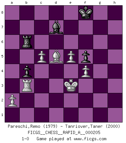 Last move : 1-0 2018 April 28 0:51:48 [Event "FICGS__CHESS__RAPID_A__000205"] [Site "FICGS"] [Date "2017.11.30"] [Round "1"] [White "Pareschi,Remo"] [Black "Tanriover,Taner"] [Result "1-0"] [WhiteElo "1979"] [BlackElo "2000"] 1.d4 f5 2.g3 Nf6 3.Bg2 e6 4.Nh3 d5 5.Nf4 c5 6.e3 Nc6 7.O-O Be7 8.c4 dxc4 9.Nc3 O-O 10.Qe2 Na5 11.Rd1 Qe8 12.Bd2 g5 13.Nh3 cxd4 14.exd4 h6 15.f4 g4 16.Nf2 Bd8 17.Re1 Qd7 18.Rad1 Re8 19.Nb1 Bb6 20.Bc3 Nd5 21.Na3 Rd8 22.Nxc4 Nxc4 23.Qxc4 h5 24.Nd3 h4 25.gxh4 Qf7 26.Kh1 Qh5 27.Re5 Nxc3 28.bxc3 Kg7 29.Nc5 Bxc5 30.Rxc5 Qxh4 31.Rc7+ Kg6 32.h3 Rh8 33.Qe2 Rb8 34.Rd3 b6 35.Qe5 Qf6 36.Rxa7 Qxe5 37.dxe5 b5 38.Kg1 Rh7 39.Rxh7 Kxh7 40.hxg4 b4 41.gxf5 exf5 42.c4 Be6 43.Bd5 Bd7 44.Kf2 Rb6 45.Ke3 Kg7 46.Rb3 Kf8 47.c5 1-0 Dutch defense, Blackburne variation Kingside Castling by player White (move 7) Kingside Castling by player Black (move 9) Player White won this chess game. Follow this game move after move (download)Place the contents of the Chess box in a hat, shake them up vigorously, pour them on the board from a height of two feet, and you get the style of Steinitz. (H. E. Bird) Jeder leidlich begabte Spieler, er braucht keineswegs hervorragend veranlagt zu sein, kann es zum Meister bringen. Aber das ist ja auch gar nicht nötig! Der richtige Standpunkt ist es, zu seinem Vergnügen zu spielen, und man glaube ja nicht, dass der Genuss proportional dem Können sei. (Siegbert Tarrasch) ¿Que sería del Ajedrez sin errores graciosos?. (Kurt Richter) On entre au jeu d'Echecs comme on entre en Religion. Pour le joueur d'Echecs, la partie d'Echecs c'est l'office, la messe, le défilé du 1er Mai, le dépôt de gerbe au Monument aux Morts. C'est un drame sacré. (Michel Roos) Internal peace cannot coexist with external war. (Don Groves)
