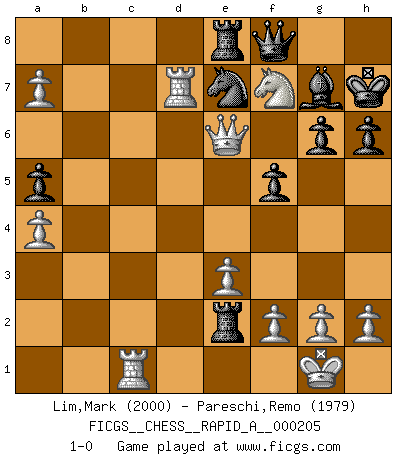 Last move : 1-0 2018 March 20 9:5:20 [Event "FICGS__CHESS__RAPID_A__000205"] [Site "FICGS"] [Date "2017.11.30"] [Round "1"] [White "Lim,Mark"] [Black "Pareschi,Remo"] [Result "1-0"] [WhiteElo "2000"] [BlackElo "1979"] 1.d4 g6 2.Nf3 d6 3.e3 Bg7 4.Be2 f5 5.O-O Nf6 6.c4 O-O 7.Nc3 e6 8.b4 a5 9.b5 Nbd7 10.Ba3 Kh8 11.c5 dxc5 12.dxc5 Qe7 13.Rc1 Re8 14.Qb3 Nxc5 15.Qc4 b6 16.Na4 Nfe4 17.Bxc5 bxc5 18.Nxc5 Nd6 19.Qc2 Rb8 20.a4 c6 21.Na6 Bxa6 22.bxa6 Rb2 23.Qxc6 Rxe2 24.Rfd1 Nc8 25.Rd7 Qf8 26.Ng5 Ne7 27.Qxe6 h6 28.Nf7+ Kh7 29.a7 1-0 Modern defense Kingside Castling by player White (move 5) Kingside Castling by player Black (move 6) Player White won this chess game. Follow this game move after move (download)It is always better to sacrifice your opponent's men. (Savielly Tartakower) Ich war zu klein für die Schach-Schülermannschaft! (Woody Allen) No hay un Gran Maestro de Ajedrez que sea normal; solo se diferencían ellos por la magnitud de su locura. (Viktor Korchnoi) Vous savez, camarade Pachman, je n'éprouve pas de plaisir à être ministre, je jouerais plutôt aux échecs comme vous, ou alors ferais une révolution au Venezuela. (Che Guevara à Ludek Pachman, 'Checkmate in Prague', 1975) Art disturbs, science reassures. (Georges Braque, Le Jour et la Nuit)