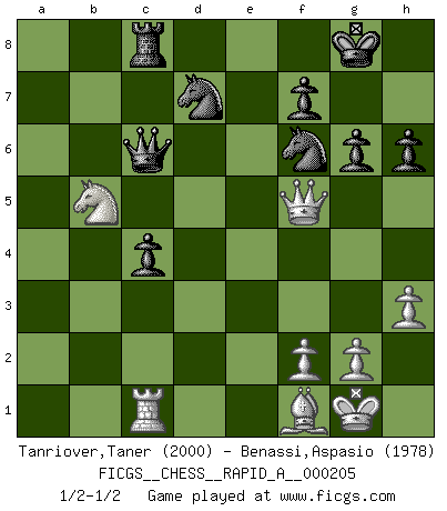 Last move : 1/2-1/2 2017 December 23 15:58:38 [Event "FICGS__CHESS__RAPID_A__000205"] [Site "FICGS"] [Date "2017.11.30"] [Round "1"] [White "Tanriover,Taner"] [Black "Benassi,Aspasio"] [Result "1/2-1/2"] [WhiteElo "2000"] [BlackElo "1978"] 1.h3 e5 2.a3 d5 3.e3 Bd6 4.d4 Nd7 5.c4 dxc4 6.Bxc4 exd4 7.Nf3 dxe3 8.Bxe3 Ngf6 9.Nc3 a6 10.O-O O-O 11.Qc2 b5 12.Bd3 h6 13.Rad1 Bb7 14.Nd4 Re8 15.Nf5 Bf8 16.Be2 Qc8 17.Rfe1 Nc5 18.Ng3 Ncd7 19.Nf5 Ne5 20.Bf1 c5 21.Bf4 Ng6 22.Bd6 Rxe1 23.Rxe1 Bc6 24.Bxf8 Qxf8 25.a4 c4 26.axb5 axb5 27.Nd4 Qc5 28.Nxc6 Qxc6 29.b3 Rc8 30.bxc4 bxc4 31.Qf5 Nf8 32.Rc1 N8d7 33.Nb5 g6 1/2-1/2 Global Opening Kingside Castling by player White (move 10) Kingside Castling by player Black (move 10) This chess game ended in a draw. Follow this game move after move (download)When you don't know what to do, wait for your opponent to get an idea - it's sure to be wrong. (Tarrasch) Wenn ich mich einlogge, glauben die Leute gewöhnlich nicht, dass ich es selbst bin und sie fangen an, mir dumme Fragen zu stellen. Und wenn sie es glauben, stellen sie wieder andere dumme Fragen. (Judith Polgar) El Ajedrez es de 30 a 40 por ciento psicología. Uno no cuenta con esto cuando se juega contra una computadora. No lo puedo confundir. (Judith Polgar) Karpov est une pièce de musée. (Garry Kasparov) A good book on your shelf is a friend that turns its back on you and remains a friend. (Author unknown)