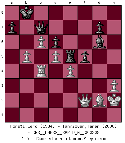 Last move : 1-0 2018 February 25 23:3:29 [Event "FICGS__CHESS__RAPID_A__000205"] [Site "FICGS"] [Date "2017.11.30"] [Round "1"] [White "Forsti,Eero"] [Black "Tanriover,Taner"] [Result "1-0"] [WhiteElo "1984"] [BlackElo "2000"] 1.f4 e5 2.fxe5 d6 3.exd6 Nf6 4.Nf3 Bxd6 5.g3 Nc6 6.Bg2 Bg4 7.O-O Qe7 8.c3 h5 9.d4 h4 10.gxh4 O-O-O 11.Bg5 Rde8 12.Nbd2 Qd7 13.Nc4 Ne4 14.Qd3 Nxg5 15.Nxd6+ cxd6 16.hxg5 Bf5 17.Qd2 Re4 18.Rf2 Rg4 19.Raf1 Bg6 20.d5 Ne7 21.Ne1 Rh5 22.Rf4 Rhxg5 23.e4 Kb8 24.c4 f6 25.Rxg4 Rxg4 26.h3 Rh4 27.Qf2 Rh5 28.Nd3 b6 29.b4 Rg5 30.Kh2 Qc7 31.Rc1 Bf7 32.a4 Ng6 33.a5 Ne5 34.Nxe5 Rxe5 35.axb6 Qxb6 36.c5 Qc7 37.c6 Bg6 38.Rc4 f5 39.b5 1-0 Bird : From gambit Kingside Castling by player White (move 7) Queenside Castling by player Black (move 10) Player White won this chess game. Follow this game move after move (download)Adequate compensation for a sacrifice is having a sound combination leading to a winning position; adequate compensation for a blunder is having your opponent snatch defeat from the jaws of victory. (Bruce A. Moon) Schach ist gnadenlos. Du mußt bereit sein zu töten. (Nigel Short) Después de la respuesta de las negras a 1.e4 con 1..e5, se quedan siempre tratando de entrar dentro del juego. (Howard Staunton) Le jeu d'échecs est comme rejeté hors du temps. (Antoine de Saint-Exupéry) Opportunities multiply as they are seized. (Sun Tzu)