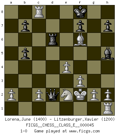 Last move : 1-0 2007 August 1 7:45:4 [Event "FICGS__CHESS__CLASS_E__000045"] [Site "FICGS"] [Date "2007.04.17"] [Round "1"] [White "Lorena,June"] [Black "Litzenburger,Xavier"] [Result "1-0"] [WhiteElo "1400"] [BlackElo "1200"] 1.d4 d5 2.e4 e5 3.Be3 Nc6 4.dxe5 Nxe5 5.Nc3 Bg4 6.f3 Bh5 7.Nxd5 c6 8.Be2 cxd5 9.Qd4 Nc6 10.O-O-O Nxd4 11.Bxd4 Be7 12.Bxg7 Bf6 13.Rxd5 Qb6 14.Bb5+ Ke7 15.Bxh8 Qe3+ 16.Kd1 Bxb2 17.Bxb2 Nf6 18.Re5+ Kf8 19.Ne2 Rd8+ 20.Ke1 Qd2+ 21.Kf2 a6 22.Rc5 axb5 23.Bxf6 Rd6 24.Rc8+ 1-0 Blackmar gambit Queenside Castling by player White (move 10) Player White won this chess game. Follow this game move after move (download)Chess, like love, is infectious at any age. (Flohr) Sie bekommen vielleicht den Eindruck, dass die Spitzenspieler überhaupt gar nicht so stark sind. Aber das stimmt nicht. Es ist eine Illusion. Mit einem Computer an der Seite ist es sehr leicht, Urteile zu fällen, aber wenn man alleine am Brett sitzt, sieht die Sache ganz anders aus. (Vladimir Kramnik) El Ajedrez es el gimnasio de la mente. (Blaise Pascal) Les échecs sont plus proches de l'art de l'assassinat que de l'art de la guerre. (Arturo Perez-Reverte) Whoever said the pen is mightier than the sword obviously never encountered automatic weapons. (US General Douglas MacArthur)