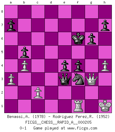 Last move : 0-1 2018 January 8 17:58:21 [Event "FICGS__CHESS__RAPID_A__000205"] [Site "FICGS"] [Date "2017.11.30"] [Round "1"] [White "Benassi,Aspasio"] [Black "Rodriguez Perez,Rene"] [Result "0-1"] [WhiteElo "1978"] [BlackElo "1952"] 1.e4 e6 2.d4 d5 3.Nc3 Nf6 4.exd5 exd5 5.Nf3 Bd6 6.Bd3 O-O 7.O-O c6 8.h3 Re8 9.Re1 Rxe1+ 10.Qxe1 Qc7 11.Bd2 Nbd7 12.Qe3 b5 13.a3 Bb7 14.Nh4 Re8 15.Qf3 g6 16.Bg5 Re6 17.g3 Qb6 18.Ne2 Bf8 19.Qg2 c5 20.dxc5 Bxc5 21.b4 Bf8 22.Be3 Rxe3 23.fxe3 Bh6 24.Nf4 Qxe3+ 25.Kh2 Ne5 26.Rf1 Ne4 27.Bxe4 dxe4 28.Rd1 Bg5 29.Nd5 Bxd5 30.Rxd5 f6 31.Rd8+ Kf7 32.Rd1 f5 33.Rf1 Bxh4 34.gxh4 Nf3+ 35.Kh1 Nxh4 36.Qg4 Nf3 37.Qg3 Kf6 38.h4 f4 0-1 French defense Kingside Castling by player Black (move 6) Kingside Castling by player White (move 7) Player Black won this chess game. Follow this game move after move (download)After a bad opening, there is hope for the middle game. After a bad middle game, there is hope for the endgame. But once you are in the endgame, the moment of truth has arrived. (Edmar Mednis) Bogoljubow: Matt in vier Zügen! Tartakower: Ich verbitte mir jede Belästigung! (Savielly Grigorievitsch Tartakower) El Ajedrez se juega con la mente... ¡no con las manos!. (Renaud y Kahn) La conception d'un plan est le processus par lequel un joueur exploite les avantages de sa position tout en s'efforçant d'en réduire au minimum les inconvénients. Afin de garantir le succès, un plan doit toujours se fonder sur un diagnostic objectif des particularités d'une position. La conception d'un plan est d'autant plus difficile que la position est équilibrée, et grandement facilitée lorsqu'il n'existe qu'un seul plan susceptible de répondre aux exigences de la position. (Harry Golombek) They misunderestimated me. (George W. Bush, Bentonville nov. 6, 2000)