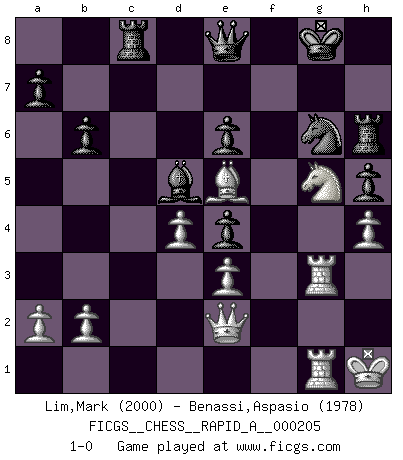 Last move : 1-0 2018 January 4 23:16:33 [Event "FICGS__CHESS__RAPID_A__000205"] [Site "FICGS"] [Date "2017.11.30"] [Round "1"] [White "Lim,Mark"] [Black "Benassi,Aspasio"] [Result "1-0"] [WhiteElo "2000"] [BlackElo "1978"] 1.d4 e6 2.Nf3 Nf6 3.e3 d5 4.Bd3 Be7 5.Nbd2 c5 6.c3 b6 7.Ne5 O-O 8.O-O Qc7 9.Qe2 Nc6 10.f4 Bb7 11.Rf3 g6 12.h4 Bd6 13.Rh3 h5 14.Ndf3 Ne7 15.Bd2 Ne4 16.Ng5 Nf6 17.Rc1 Ne4 18.Bxe4 dxe4 19.g4 Bxe5 20.fxe5 Qd7 21.gxh5 f6 22.exf6 Rxf6 23.Be1 cxd4 24.cxd4 Rc8 25.Rd1 Qe8 26.Bg3 gxh5 27.Be5 Rh6 28.Kh1 Bd5 29.Rg1 Ng6 30.Rhg3 1-0 Queen's pawn Kingside Castling by player Black (move 7) Kingside Castling by player White (move 8) Player White won this chess game. Follow this game move after move (download)I won't play with you anymore. You have insulted my friend. - When an opponent cursed himself for a blunder. (Miguel Najdorf) Es tut gut, die Entwicklungsperiode von, [...] demokratischem Geist durchdringen zu lassen. Wie undemokratisch wäre es doch beispielsweise, den einen Offizier große Spaziertouren vornehmen zu lassen, während die anderen zu Hause säßen und sich entsetzlich langweilten. (Aaron Nimzowitsch) Si el Ajedrez es una ciencia, es la mas inexacta. Si el Ajedrez es un arte, es demasiado inexacto para ser visto como tal. Si el Ajedrez es un deporte, es demasiado esotérico. Si el Ajedrez es un juego, es demasiado exigente para ser solo un juego. Si el Ajedrez es una aventura, es una muy demandante. Si el Ajedrez es una pasión, es una muy gratificante. Si el Ajedrez es la vida, es una muy triste. (Anónimo) Que feriez-vous si vous étiez en train de jouer aux échecs et que la fin du monde arrive ? Je continuerais à jouer. (Saint Borromée) I would love to change the world, but they won't give me the source code. (Unknown)