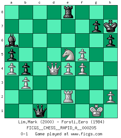 Last move : 0-1 2018 January 2 21:24:7 [Event "FICGS__CHESS__RAPID_A__000205"] [Site "FICGS"] [Date "2017.11.30"] [Round "1"] [White "Lim,Mark"] [Black "Forsti,Eero"] [Result "0-1"] [WhiteElo "2000"] [BlackElo "1984"] 1.d4 f5 2.Nf3 Nf6 3.e3 b6 4.Be2 e6 5.O-O Bb7 6.c4 Bd6 7.Nc3 O-O 8.Nb5 Be7 9.b3 d5 10.Ba3 Bxa3 11.Nxa3 Qe7 12.Nb5 dxc4 13.Bxc4 a6 14.Nc3 b5 15.Bd3 Nbd7 16.Rc1 Rad8 17.Re1 c5 18.a4 b4 19.Ne2 Kh8 20.Qc2 Rc8 21.Bc4 cxd4 22.Nexd4 Nc5 23.Ng5 Nd5 24.f4 Rfd8 25.Ndf3 a5 26.Ne5 Kg8 27.g4 h6 28.Nxe6 Nxe6 29.gxf5 Rxc4 30.Qxc4 Ng5 31.Kf2 Kh7 32.Ng6 Qd6 33.Red1 Re8 34.Rd3 Ne4+ 35.Kg1 Nec3 36.Re1 Ba6 37.Rxd5 Nxd5 38.Qd4 Qc6 39.e4 Nc3 40.Ne5 Ne2+ 41.Rxe2 Qc1+ 0-1 Dutch Kingside Castling by player White (move 5) Kingside Castling by player Black (move 7) Player Black won this chess game. Follow this game move after move (download)Botvinnik tried to take the mystery out of Chess, always relating it to situations in ordinary life. He used to call Chess a typical inexact problem similar to those which people are always having to solve in everyday life. (Garry Kasparov) Du weisst es gibt ein Problem mit Computern und Fernschach, wenn jeder eine Rating von 2450 hat. (John Christen Knudsen) El Ajedrez es tan interesante por sí solo, que no es necesario un interés monetario para persuadir a una persona a que lo practique; por lo tanto, nunca se juega por dinero. (Benjamin Franklin) Le pion, dans sa simplicité, marche droit devant lui, mais lorsqu'il prend, il le fait obliquement? Ainsi l'homme, tant qu'il reste pauvre, marche dans la droiture et vit honnêtement, mais lorsqu'il recherche les honneurs, il flatte, se parjure et, par les voies obliques, cherche une position supérieure sur l'échiquier du monde. (Jean de Galles) Internet: Absolute communication, absolute isolation. (Paul Carvel)