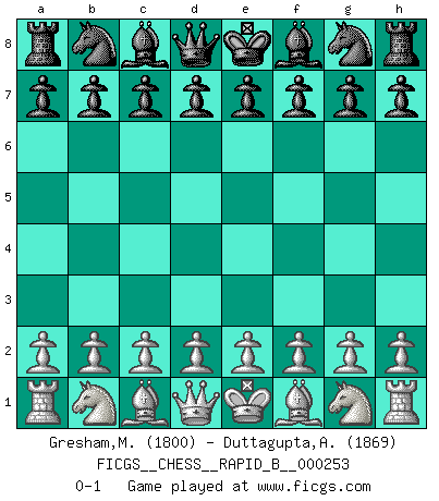 Last move : 0-1 2017 December 30 21:43:27 [Event "FICGS__CHESS__RAPID_B__000253"] [Site "FICGS"] [Date "2017.11.30"] [Round "1"] [White "Gresham,Matthew"] [Black "Duttagupta,Aniruddha"] [Result "0-1"] [WhiteElo "1800"] [BlackElo "1869"] 0-1 This chess game has been lost on time (started : 2017.11.30 15:8:53) Player Black won this chess game. Follow this game move after move (download)Personally, I rather look forward to a computer program winning the world Chess Championship. Humanity needs a lesson in humility. (Richard Dawkings) Wenn Du nicht kämpfst, um anderen etwas zu beweisen, sondern nur für Dich selbst, dann bist du fast unbesiegbar. (Garry Kasparov) El pensamiento metódico es mas útil en el Ajedrez que la inspiración. (C. J. S. Purdy) Lorsque vous vous retrouvez devant une position atroce, ne tendez pas un ultime piège dérisoire avec l'intention d'abandonner si l'adversaire le déjoue ! Faites-vous plutôt un devoir de résister comme si votre vie en dépendait. Jouez le coup qui vous déplairait au centuple si vous étiez dans la peau de votre tortionnaire ! Now be brave and don't look back. Don't look back. (Shmi Skywalker in Star Wars ep.1)