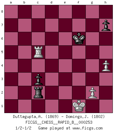 Last move : 1/2-1/2 2018 May 2 20:21:44 [Event "FICGS__CHESS__RAPID_B__000253"] [Site "FICGS"] [Date "2017.11.30"] [Round "1"] [White "Duttagupta,Aniruddha"] [Black "Domingo,Jordi"] [Result "1/2-1/2"] [WhiteElo "1869"] [BlackElo "1802"] 1.e4 e5 2.Nf3 d6 3.d4 exd4 4.Nxd4 Nf6 5.Nc3 Be7 6.Bc4 O-O 7.O-O Nc6 8.Bf4 Ne5 9.Bb3 c5 10.Nf3 Qc7 11.Nd2 a6 12.a4 c4 13.Bxe5 cxb3 14.Bd4 bxc2 15.Qxc2 Be6 16.Qd3 Rac8 17.f4 Rfe8 18.Rad1 Qc6 19.Qg3 Nh5 20.Qf3 Bf6 21.Ba7 Bxc3 22.bxc3 Nf6 23.Bd4 Qxa4 24.Rb1 Qd7 25.f5 Bc4 26.Rfd1 Qe7 27.Nxc4 Rxc4 28.Qg3 Kh8 29.Rb6 Qxe4 30.Rxd6 Qxf5 31.Rf1 Qg6 32.Qf2 Ne4 33.Rxg6 Nxf2 34.Rxg7 Rxd4 35.Rxf7 Rd2 36.R1xf2 Re1+ 37.Rf1 Rxf1+ 38.Kxf1 Rb2 39.c4 Kg8 40.Rd7 a5 41.Rd8+ Kf7 42.Ra8 b6 43.c5 bxc5 44.Rxa5 c4 45.Rc5 Rc2 46.Rc7+ Kg6 47.h4 c3 48.Rc5 Kf6 1/2-1/2 Philidor : Exchange variation Kingside Castling by player Black (move 6) Kingside Castling by player White (move 7) 10 pieces endgame at move 38 : White KRPPP , Black KRPPP WHITE : King + 1 Rook 3 Pawns BLACK : King + 1 Rook 3 Pawns 9 pieces endgame at move 43 : White KRPP , Black KRPPP WHITE : King + 1 Rook 2 Pawns BLACK : King + 1 Rook 3 Pawns 8 pieces endgame at move 44 : White KRPP , Black KRPP WHITE : King + 1 Rook 2 Pawns BLACK : King + 1 Rook 2 Pawns This chess game ended in a draw. Follow this game move after move (download)I believe that Chess possesses a magic that is also a help in advanced age. A rheumatic knee is forgotten during a game of Chess and other events can seem quite unimportant in comparison with a catastrophe on the chessboard. (Vlastimil Hort) Sie bekommen vielleicht den Eindruck, dass die Spitzenspieler überhaupt gar nicht so stark sind. Aber das stimmt nicht. Es ist eine Illusion. Mit einem Computer an der Seite ist es sehr leicht, Urteile zu fällen, aber wenn man alleine am Brett sitzt, sieht die Sache ganz anders aus. (Vladimir Kramnik) El Ajedrez es realmente noventa y nueve por ciento calculación. (Soltis) Vouloir jouer aux échecs contre soi-même est aussi paradoxal que vouloir marcher sur son ombre. (Stefan Zweig) Who needs drugs and alcohol if he can play Big Chess at FICGS ? (Heinz-Georg Lehnhoff)