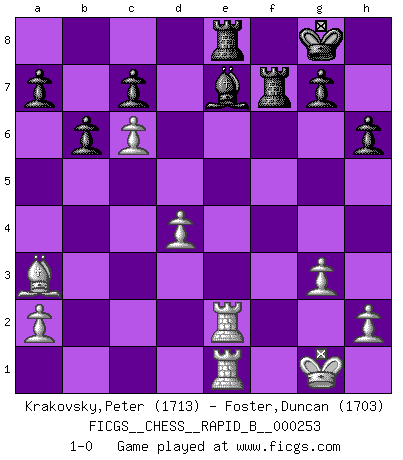 Last move : 1-0 2018 February 28 17:12:32 [Event "FICGS__CHESS__RAPID_B__000253"] [Site "FICGS"] [Date "2017.11.30"] [Round "1"] [White "Krakovsky,Peter"] [Black "Foster,Duncan"] [Result "1-0"] [WhiteElo "1713"] [BlackElo "1703"] 1.d4 f5 2.Nf3 Nf6 3.g3 e6 4.Bg2 Be7 5.c4 O-O 6.O-O d6 7.Nc3 Ne4 8.Qc2 Nxc3 9.bxc3 Nc6 10.Rb1 e5 11.e4 f4 12.c5 b6 13.Qd3 dxc5 14.Qc4+ Kh8 15.Qd5 Qxd5 16.exd5 Bf5 17.Rb2 Na5 18.Nxe5 fxg3 19.fxg3 Rae8 20.Re2 cxd4 21.cxd4 Kg8 22.Nc6 Nxc6 23.dxc6 Bg6 24.Bd5+ Bf7 25.Bxf7+ Rxf7 26.Rfe1 h6 27.Ba3 1-0 Dutch Kingside Castling by player Black (move 5) Kingside Castling by player White (move 6) Player White won this chess game. Follow this game move after move (download)Combinations have always been the most intriguing aspect of Chess. The masters look for them, the public applauds them, the critics praise them. It is because combinations are possible that Chess is more than a lifeless mathematical exercise. They are the poetry of the game; they are to Chess what melody is to music. They represent the triumph of mind over matter. (Reuben Fine) Was ist der Unterschied zwischen einem Strassenarbeiter und einem Schachspieler? --Der Schachspieler bewegt sich ab und zu. (Anonymous) Uno no tiene que jugar muy bien, es suficiente jugar mejor que el oponente. (Siegbert Tarrasch) Je ne suis pas le dernier à jouer lâchement des coups douteux pendant le zeïtnot de l'adversaire pour l'achever: en effet les coups qui font le plus peur sont ceux que l'on ne comprend pas. Je me fais souvent peur quand je joue. (Un professeur anonyme) Thibault, I ask for draw. Game 13876. - Sorry Ilmars, you won. (FICGS chat)