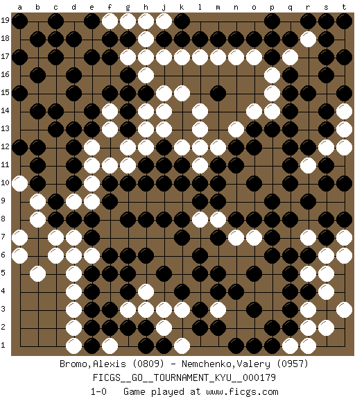 Last move : 1-0 2018 March 17 8:5:28 [Event "FICGS__GO__TOURNAMENT_KYU__000179"] [Site "FICGS"] [Date "2017.12.29"] [Round "1"] [Black "Bromo,Alexis"] [White "Nemchenko,Valery"] [Result "1-0"] [Rating 1 "0809"] [Rating 2 "0957"] 1.q16 d4 2.d16 q4 3.q10 o9 4.d10 e12 5.g13 f13 6.e14 g12 7.h11 g11 8.f10 f11 9.d13 h12 10.j13 h13 11.g14 h14 12.h15 j14 13.j12 j11 14.h10 k12 15.k13 l13 16.k14 k15 17.k11 l14 18.m15 l11 19.k10 l10 20.l9 k9 21.j10 l8 22.m9 m8 23.k8 j9 24.j8 h9 25.g10 g9 26.f9 f8 27.g8 e10 28.h8 e9 29.e8 d9 30.d8 c10 31.d11 e11 32.d12 c11 33.c9 c12 34.c13 b13 35.b14 a14 36.b12 a13 37.b10 f14 38.g15 b9 39.c8 b8 40.b7 a10 41.b11 b15 42.c14 c15 43.d15 c16 44.c17 b17 45.b18 a18 46.c18 b19 47.c19 a16 48.a19 a7 49.a17 c7 50.b6 c6 51.b16 a6 52.a15 b5 53.a12 f7 54.e7 e6 55.f6 g7 56.g6 h7 57.h6 j7 58.k7 j6 59.j5 k6 60.l6 k5 61.k4 l5 62.m5 l4 63.l3 m4 64.n4 m3 65.m2 n3 66.o3 n2 67.n1 o2 68.p2 p3 69.o1 o4 70.o5 p4 71.n8 n9 72.m7 n7 73.o8 o7 74.p8 p5 75.p6 q6 76.p7 q7 77.q8 r8 78.r9 s9 79.s8 r7 80.s7 s6 81.q3 r3 82.q2 r2 83.r4 s4 84.q5 r5 85.q4 q1 86.r6 s5 87.s10 t7 88.t8 t6 89.p1 r1 90.s3 s2 91.m10 n10 92.m11 m12 93.n11 o11 94.p9 p10 95.o10 p11 96.l12 l11 97.n12 n13 98.o12 p12 99.o13 o14 100.p13 q12 101.q13 r13 102.r12 r11 103.q11 p14 104.q14 p15 105.q15 p16 106.p17 o17 107.o18 n17 108.n18 m17 109.m18 l17 110.l18 k17 111.k18 j17 112.j18 h16 113.g16 g17 114.f17 h18 115.g18 h17 116.l10 l12 117.j12 j13 118.j11 f5 119.e5 d6 120.e4 d5 121.e3 d3 122.e2 d2 123.e1 d1 124.f15 j15 125.e13 f4 126.f3 g3 127.g4 s12 128.q12 r14 129.r15 s15 130.s13 t13 131.s14 t14 132.s11 t9 133.t10 t12 134.s16 t16 135.t15 t17 136.s17 t18 137.s18 s19 138.t19 t18 139.r19 g19 140.f18 r18 141.t19 q19 142.s19 q17 143.p18 h4 144.g5 j3 145.g2 h3 146.h2 j2 147.j1 k1 148.h1 k3 149.l2 j19 150.q18 d7 151.f5 r7 152.q6 l4 153.l5 m3 154.m4 t16 155.t17 e18 156.e17 f19 157.d18 d19 158.e19 h19 159.k19 f1 160.f2 t3 161.p19 pass 162.pass 1-0 Here are the names of the openings (joseki) played in the four corners : Corner d16 : d16 e12 Hoshi (Hwajeom, Seongjeom, Xingwei`) 4-4 Point. The star or hoshi (4-4) point, emphasizing influence at the potential expense of territory. Corner q16 : q16 l13 Hoshi (Hwajeom, Seongjeom, Xingwei`) 4-4 Point. The star or hoshi (4-4) point, emphasizing influence at the potential expense of territory. Player Black won this Go (weiqi, baduk) game. Follow this game move after move (download)There is damezumari at the bamboo joint. (Anonymous) Life is the sum of all your choices. (Albert Camus)