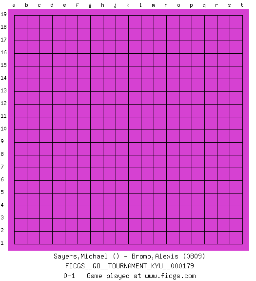 Last move : 0-1 2018 February 27 3:34:55 [Event "FICGS__GO__TOURNAMENT_KYU__000179"] [Site "FICGS"] [Date "2018.01.28"] [Round "1"] [Black "Sayers,Michael"] [White "Bromo,Alexis"] [Result "0-1"] [Rating 2 "0809"] 0-1 This go game has been lost on time (started : 2018.01.28 3:22:15) Here are the names of the openings (joseki) played in the four corners : Player White won this Go (weiqi, baduk) game. Follow this game move after move (download)On the third line, four die, six live. (Anonymous) The leaves of memory seemed to make a mournful rustling in the dark. (Henry Wadsworth Longfellow)