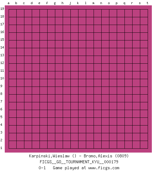 Last move : 0-1 2018 February 19 2:29:23 [Event "FICGS__GO__TOURNAMENT_KYU__000179"] [Site "FICGS"] [Date "2018.01.20"] [Round "1"] [Black "Karpinski,Wieslaw"] [White "Bromo,Alexis"] [Result "0-1"] [Rating 2 "0809"] 0-1 This go game has been lost on time (started : 2018.01.20 1:57:20) Here are the names of the openings (joseki) played in the four corners : Player White won this Go (weiqi, baduk) game. Follow this game move after move (download)Eyes win semiais. (Anonymous) Luck never gives; it only lends. (Swedish proverb)