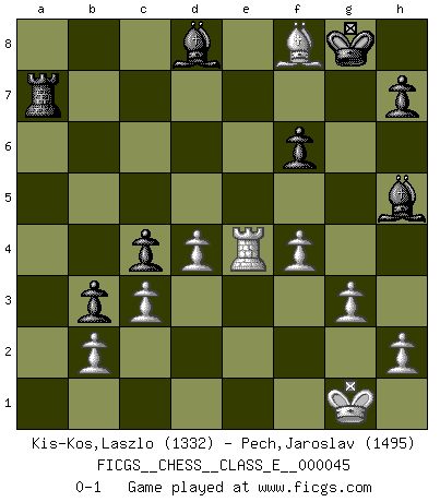 Last move : 0-1 2007 November 24 18:36:33 [Event "FICGS__CHESS__CLASS_E__000045"] [Site "FICGS"] [Date "2007.04.17"] [Round "1"] [White "Kis-Kos,Laszlo"] [Black "Pech,Jaroslav"] [Result "0-1"] [WhiteElo "1332"] [BlackElo "1495"] 1.e4 e5 2.Nf3 Nc6 3.Bb5 a6 4.Ba4 Nf6 5.O-O Be7 6.Re1 b5 7.Bb3 O-O 8.c3 d5 9.exd5 Nxd5 10.Nxe5 Nxe5 11.Rxe5 c6 12.d4 Bd6 13.Re1 Qh4 14.g3 Qh3 15.Re4 g5 16.Qe2 Bf5 17.Nd2 Nf6 18.f3 c5 19.Qf2 c4 20.Bc2 Bg6 21.Bb1 Nxe4 22.Nxe4 Be7 23.Bxg5 f6 24.Bf4 Rae8 25.a4 Qe6 26.Bh6 Rf7 27.axb5 axb5 28.Bc2 Kh8 29.Qd2 Qd5 30.Qf4 b4 31.Ba4 Ra8 32.Qe3 b3 33.Qe2 Bd8 34.Nc5 Rfa7 35.Re1 Rxa4 36.Nxa4 Rxa4 37.f4 Ra7 38.Bf8 Bh5 39.Qe4 Qxe4 40.Rxe4 Kg8 0-1 Ruy Lopez : Closed, 7...O-O Kingside Castling by player White (move 5) Kingside Castling by player Black (move 7) Player Black won this chess game. Follow this game move after move (download)To avoid losing a piece, many a person has lost the game. (Savielly Tartakover) Schach ist das schnellste Spiel der Welt, weil man in jeder Sekunde Tausende von Gedanken ordnen muß. (Albert Einstein) El Ajedrez es tortura mental. (Garry Kasparov) Des combinaisons [dans le jeu d'échecs] pareilles à des mélodies. Je crois entendre pour ainsi dire la musique des coups... (Vladimir Nabokov) I've lost money so fast in these clubs it's left me reeling. I've read every poker book ever written, but the only way to get better at the game is to go out and play with people who are really good. The problem is, you stand to lose a lot of money doing it. (Matt Damon)