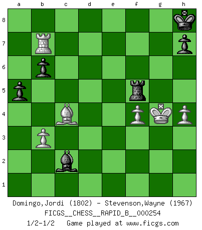 Last move : 1/2-1/2 2018 February 6 4:5:56 [Event "FICGS__CHESS__RAPID_B__000254"] [Site "FICGS"] [Date "2017.12.30"] [Round "1"] [White "Domingo,Jordi"] [Black "Stevenson,Wayne"] [Result "1/2-1/2"] [WhiteElo "1802"] [BlackElo "1967"] 1.e4 d6 2.d4 Nf6 3.Nc3 Nbd7 4.f4 e5 5.Nf3 exd4 6.Qxd4 c6 7.Be3 d5 8.exd5 Bc5 9.Qd3 O-O 10.dxc6 Re8 11.Ne5 Nxe5 12.Qxd8 Rxd8 13.Bxc5 Nxc6 14.Bd3 Re8+ 15.Kf2 b6 16.Ba3 Nd4 17.Rhe1 Bf5 18.Nb5 Nxb5 19.Bxb5 Rxe1 20.Rxe1 Bxc2 21.Be7 Bf5 22.Bxf6 gxf6 23.g4 Be6 24.b3 f5 25.gxf5 Bxf5 26.Re5 Bb1 27.Re7 Bxa2 28.Bc4 a5 29.Rxf7 Rf8 30.Ra7 Kh8 31.Kf3 Bb1 32.Kg4 Rf5 33.h4 Bc2 34.Rb7 1/2-1/2 Pirc defense Kingside Castling by player Black (move 9) This chess game ended in a draw. Follow this game move after move (download)Fischer is the strongest player in the world. In fact, the strongest player who ever lived. (Larry Evans) Im Reiche der Wirklichkeit ist man nie so glücklich wie im Reiche der Gedanken. (Arthur Schopenhauer) La enorme capacidad mental, en la que sin ella no puede un jugador de Ajedrez existir, es demasiado requerida por el Ajedrez al grado de que nunca podrá liberar su mente de este juego. (Albert Einstein) Les échecs sont plus proches de l'art de l'assassinat que de l'art de la guerre. (Arturo Perez-Reverte) Life is pain my dear and anyone who says otherwise is selling something. (Princess Bride)