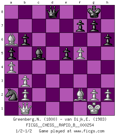 Last move : 1/2-1/2 2018 March 25 22:19:6 [Event "FICGS__CHESS__RAPID_B__000254"] [Site "FICGS"] [Date "2017.12.30"] [Round "1"] [White "Greenberg,Normund"] [Black "van Dijk,Erik L."] [Result "1/2-1/2"] [WhiteElo "1800"] [BlackElo "1983"] 1.e4 c5 2.Nf3 d6 3.d4 cxd4 4.Nxd4 Nf6 5.Nc3 a6 6.Bg5 Nbd7 7.Be2 e6 8.O-O Be7 9.a4 O-O 10.Re1 h6 11.Be3 Qc7 12.f4 b6 13.Bf3 Bb7 14.f5 e5 15.Nb3 Rac8 16.Bf2 Rfd8 17.Re2 Nc5 18.Qe1 Nxb3 19.cxb3 d5 20.exd5 Bb4 21.Rd1 Nxd5 22.Red2 Nxc3 23.Rxd8+ Rxd8 24.Rxd8+ Qxd8 25.Bxb7 Na2 26.Qb1 a5 27.Ba6 Bc5 1/2-1/2 Sicilian : Najdorf, 6.Bg5 Kingside Castling by player White (move 8) Kingside Castling by player Black (move 9) This chess game ended in a draw. Follow this game move after move (download)The combination player thinks forward; he starts from the given position, and tries the forceful moves in his mind. (Emanuel Lasker) Es gibt keine einzige Frau, der ich nicht einen Springer vorgeben könnte und trotzdem gewänne. (Robert James Fischer) Cuando le juegas a Fischer, no es una cuestion de si vas a ganar o perder. Es una cuestion de si vas a sobrevivir. (Boris Spassky) J'apprécie les joueurs d'est-indienne, c'est grâce à eux que je nourris ma famille depuis tant d'années. (Petrosian) No enterprise is more likely to succeed than one concealed from the enemy until it is ripe for execution. (Niccolo Machiavelli)