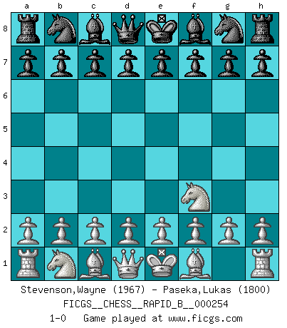 Last move : 1-0 2018 January 31 0:17:1 [Event "FICGS__CHESS__RAPID_B__000254"] [Site "FICGS"] [Date "2017.12.30"] [Round "1"] [White "Stevenson,Wayne"] [Black "Paseka,Lukas"] [Result "1-0"] [WhiteElo "1967"] [BlackElo "1800"] 1.Nf3 1-0 This chess game has been lost on time (started : 2017.12.30 1:21:43) Reti Opening Player White won this chess game. Follow this game move after move (download)Blessed be the memory of him who gave the world this immortal game. (A. G. Gardiner) Garry Kasparov war erst in der Großmeister-Organisation GMA, dann in der Profischach-Vereinigung PCA, zum Schluss kehrte er wieder in den Schoß der FIDE zurück. Aber gut, manche Leute sind flexibel (Viswanathan Anand) Repentinamente, me resultaba obvio en mi analisis que yo había pasado por alto lo que Fischer había visto en el tablero con la mas grande facilidad. (Mikhail Botvinnik) Un journaliste : 'Vous préférez avoir une dame de plus sur l'échiquier ou au lit ?' Boris Spassky : 'Ca dépend de la position.' Question: Is 'This statement is paradoxical' a paradoxical statement ? Or is it a meta-paradox ? (Normajean Yates)