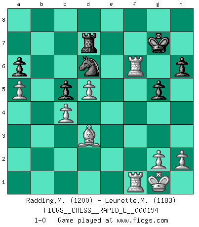 Last move : 1-0 2017 December 25 10:42:37 [Event "FICGS__CHESS__RAPID_E__000194"] [Site "FICGS"] [Date "2017.11.30"] [Round "1"] [White "Radding,Marvin"] [Black "Leurette,Marc-Antoine"] [Result "1-0"] [WhiteElo "1200"] [BlackElo "1183"] 1.e4 e5 2.f4 Bc5 3.Nf3 d5 4.exd5 exf4 5.d4 Bb6 6.Bxf4 Nf6 7.c4 O-O 8.Be2 Qe7 9.O-O Bf5 10.Nc3 Nbd7 11.Re1 Ne4 12.c5 Nxc3 13.bxc3 Ba5 14.Qb3 c6 15.d6 Qe6 16.Bc4 Qg6 17.Bg3 b6 18.Nh4 Qg5 19.Nxf5 Qxf5 20.Rf1 Qg6 21.Rac1 bxc5 22.Qa4 Bb6 23.Qxc6 Rad8 24.d5 Nf6 25.a4 Rc8 26.Qb5 Ne4 27.Bf4 f5 28.a5 Bd8 29.d7 Ra8 30.Qc6 Bf6 31.Bd6 Rfd8 32.Bc7 Rf8 33.d8Q Bxd8 34.Qxa8 Qe8 35.Qxd8 Qxd8 36.Bxd8 Rxd8 37.Rxf5 Nd6 38.Rf4 g5 39.Rg4 h6 40.Bd3 Rd7 41.c4 Kg7 42.Rf1 Re7 43.Rg3 a6 44.Rgf3 Rd7 45.Rf6 1-0 KGD : Classical variation Kingside Castling by player Black (move 7) Kingside Castling by player White (move 9) Promotion Queen by player White (move 33) Player White won this chess game. Follow this game move after move (download)Though most people love to look at the games of the great attacking masters, some of the most successful players in history have been the quiet positional players. They slowly grind you down by taking away your space, tying up your pieces, and leaving you with virtually nothing to do ! (Yasser Seirawan) Sitze auf Deine Hände. (Siegbert Tarrasch) La esencia del Ajedrez es pensar acerca de lo que el Ajedrez es. (David Bronstein) Aux échecs, l'amour-propre est satisfait quand on remporte la victoire, mais il n'y a pas de honte à être battu. (Benjamin Franklin) If we don't succeed, we run the risk of failure. (George W. Bush)
