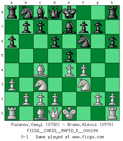 Last move : 0-1 2018 January 6 22:4:30 [Event "FICGS__CHESS__RAPID_E__000194"] [Site "FICGS"] [Date "2017.11.30"] [Round "1"] [White "Puzanov,Vasyl"] [Black "Bromo,Alexis"] [Result "0-1"] [WhiteElo "0730"] [BlackElo "0970"] 1.e4 e5 2.Nc3 Nf6 3.f4 d6 4.Nf3 h6 5.Bc4 a6 6.a3 Be7 0-1 Vienna : Falkbeer variation Player Black won this chess game. Follow this game move after move (download)In complicated positions, Bobby Fischer hardly had to be afraid of anybody. (Paul Keres) Viele Opfer benötigen überhaupt keine konkrete Berechnung. Es genügt sich die entstehende Position kurz vorzustellen, um uns davon zu überzeugen, dass das Opfer korrekt ist. (Mikhail Nekhemyevich Tal) En partidas rápidas, el Caballo es mas poderoso que el Alfil. (Vlastimil Hort) Il n'y a pas eu de défaite parce que je ne crois pas que cet ordinateur ait jamais existé. IBM a triché en refusant d'imprimer les modes de recherche de la machine. C'est évident, pendant le match, des coups décisifs ont été joués par des êtres humains. Aujourd'hui, les meilleurs spécialistes en informatique ne peuvent toujours pas expliquer comment Deep-Blue a pu jouer contre la logique des ordinateurs. IBM a gagné une guerre de communication, mais ils sont incapables de prouver que l'ordinateur a gagné tout seul. (Garry Kasparov) Those who make the worst use of their time are the first to complain of its brevity. (Jean de la Bruyere)