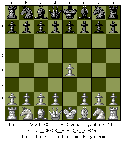 Last move : 1-0 2018 January 9 23:2:47 [Event "FICGS__CHESS__RAPID_E__000194"] [Site "FICGS"] [Date "2017.11.30"] [Round "1"] [White "Puzanov,Vasyl"] [Black "Rivenburg,John"] [Result "1-0"] [WhiteElo "0730"] [BlackElo "1143"] 1.e4 1-0 This chess game has been lost on time (started : 2017.11.30 15:51:49) King's pawn Opening Player White won this chess game. Follow this game move after move (download)The game of chess is the touchstone of the intellect. (Goethe) Obwohl ich alt bin, darf mir niemand den Finger in den Mund stecken, sonst beisse ich. (Wilhelm Steinitz) Bendita sea la memoria de aquel que dio al mundo este juego inmortal. (A. G. Gardiner) L'attaque fait le spectacle, la défense gagne les matchs. (Dicton footballistique) A specialist learns more and more about less and less until he knows everything about nothing. (Nicholas Murray Butler)