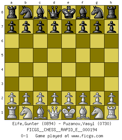 Last move : 0-1 2017 December 30 21:43:27 [Event "FICGS__CHESS__RAPID_E__000194"] [Site "FICGS"] [Date "2017.11.30"] [Round "1"] [White "Eife,Gunter"] [Black "Puzanov,Vasyl"] [Result "0-1"] [WhiteElo "0894"] [BlackElo "0730"] 0-1 This chess game has been lost on time (started : 2017.11.30 15:51:49) Player Black won this chess game. Follow this game move after move (download)Chess is imagination. (David Bronstein) Über Frauen: Chess is better. (Robert James Fischer) Las leyes del Ajedrez no permiten una libre elección: tienes que mover quieras o no. (Emanuel Lasker) On est toujours la mazette de quelqu'un d'autre. (Anonyme) Fear is the path to the dark side. Fear leads to anger; anger leads to hate; hate leads to suffering. I sense much fear in you. (Master Yoda in Star Wars ep.1)