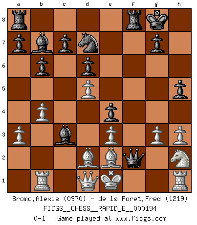 Last move : 0-1 2017 December 25 21:41:23 [Event "FICGS__CHESS__RAPID_E__000194"] [Site "FICGS"] [Date "2017.11.30"] [Round "1"] [White "Bromo,Alexis"] [Black "de la Foret,Fred"] [Result "0-1"] [WhiteElo "0970"] [BlackElo "1219"] 1.d4 f5 2.c4 Nf6 3.Nc3 e6 4.a3 Be7 5.h3 O-O 6.Nf3 b6 7.e3 Ne4 8.Nxe4 fxe4 9.Ne5 Bb7 10.b4 d6 11.Ng4 Nd7 12.d5 exd5 13.cxd5 h5 14.Nh2 Bh4 15.g3 Bf6 16.Rb1 Bc3+ 17.Bd2 Qf6 18.Be2 Qxf2+ 0-1 Dutch with c4 & Nc3 Kingside Castling by player Black (move 5) Player Black won this chess game. Follow this game move after move (download)Chess is no whit inferior to the violin, and we have a large number of professional violinists. (Mikhail Botvinnik) Wenn ich gewinne bin ich ein Genie. Wenn nicht, dann bin ich keines. (Robert James Fischer) Siempre es mejor sacrificar los hombres de tu oponente. (Savielly Tartakower) Votre seul travail dans les ouvertures est d'obtenir un milieu de partie jouable. (Lajos Portish) The hypothalamus is one of the most important parts of the brain, involved in many kinds of motivation, among other functions. The hypothalamus controls the 'Four Fs: Fighting, Fleeing, Feeding and Mating. (Unknown author)