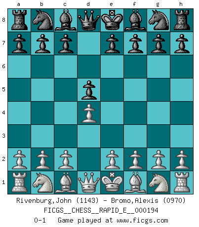 Last move : 0-1 2018 January 1 9:52:1 [Event "FICGS__CHESS__RAPID_E__000194"] [Site "FICGS"] [Date "2017.11.30"] [Round "1"] [White "Rivenburg,John"] [Black "Bromo,Alexis"] [Result "0-1"] [WhiteElo "1143"] [BlackElo "0970"] 1.d4 d5 0-1 This chess game has been lost on time (started : 2017.11.30 15:51:49) Queen's pawn game Player Black won this chess game. Follow this game move after move (download)At this time Fischer is simply a level above all the best Chessplayers in the world. (John Jacobs) Im Schach gibt es keinen Platz für Galanterie. (Irving Chernev) Aquellos que dicen que entienden al Ajedrez, no entienden nada. (Robert Hubner) Des idées, des idées, j'en ai cent, j'en ai mille. Des bonnes, des mauvaises, applicables, irréalisables... Il suffit de faire le tri ! (Roos) Experiences are the keys to life. (Daniel Parmet)