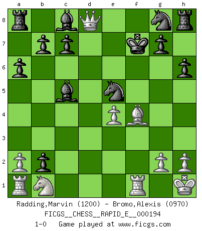 Last move : 1-0 2017 December 5 18:8:46 [Event "FICGS__CHESS__RAPID_E__000194"] [Site "FICGS"] [Date "2017.11.30"] [Round "1"] [White "Radding,Marvin"] [Black "Bromo,Alexis"] [Result "1-0"] [WhiteElo "1200"] [BlackElo "0970"] 1.e4 e5 2.f4 d6 3.Nf3 Nc6 4.Bc4 h6 5.O-O a6 6.fxe5 dxe5 7.d4 exd4 8.c3 Bc5 9.Bf4 dxc3 10.Kh1 cxb2 11.Bxf7+ Kxf7 12.Ne5+ Nxe5 13.Qxd8 1-0 King's gambit Kingside Castling by player White (move 5) Player White won this chess game. Follow this game move after move (download)Every Pawn is a potential Queen. (James Mason) Der Traum, für den ich lebe, ist der von einem freien Russland. Viele mögen sagen: Russland hat doch ein Parlament, einen gewählten Präsidenten. Aber ich spüre, dass in meiner Heimat die Angst wiederkehrt. Eine Angst, sich frei zu äußern, bestimmte Dinge zu tun (Garry Kasparov) Todos los jugadores de Ajedrez deberían tener un pasatiempo. (Savielly Tartakower) Les Echecs sont et restent toujours un combat, un combat intégral comme la boxe, la lutte ou un autre sport, et où il doit y avoir un vainqueur et un vaincu. (Joseph Emil Diemer) The production of too many useful things results in too many useless people. (Karl Marx)