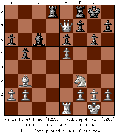 Last move : 1-0 2017 December 18 17:18:51 [Event "FICGS__CHESS__RAPID_E__000194"] [Site "FICGS"] [Date "2017.11.30"] [Round "1"] [White "de la Foret,Fred"] [Black "Radding,Marvin"] [Result "1-0"] [WhiteElo "1219"] [BlackElo "1200"] 1.e4 c5 2.d4 cxd4 3.c3 dxc3 4.Nxc3 Nc6 5.Nf3 d6 6.Bb5 Bd7 7.O-O Nf6 8.Re1 a6 9.Bc4 b5 10.Bb3 g6 11.Bg5 Bg7 12.Nd5 e6 13.Bxf6 Bxf6 14.Nxf6+ Qxf6 15.Qxd6 Qe7 16.e5 O-O 17.Rac1 Rad8 18.Rxc6 Bxc6 19.Qxe7 1-0 Sicilian : Smith-Morra gambit Kingside Castling by player White (move 7) Kingside Castling by player Black (move 16) Player White won this chess game. Follow this game move after move (download)My God, Bobby Fischer plays so simply. (Alexei Suetin) Ich hatte meine größten Erfolge, als ich 47 Jahre alt war. Kasparow war noch nicht mal 42 und hat das Schach schon im Stich gelassen. (Viktor Kortschnoi) Cuando no sepas que mover, espera por una idea que se le venga a la la cabeza de tu oponente. Tenlo por seguro de que esa idea estará incorrecta. (Siegbert Tarrasch) Le génie consiste à savoir transgresser les règles au moment opportun. (Teichmann) Once you start thinking you have nothing left to learn, you have everything to learn. (Steve Badget)