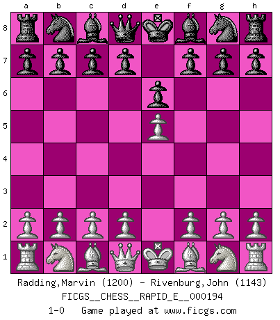 Last move : 1-0 2017 December 31 21:52:45 [Event "FICGS__CHESS__RAPID_E__000194"] [Site "FICGS"] [Date "2017.11.30"] [Round "1"] [White "Radding,Marvin"] [Black "Rivenburg,John"] [Result "1-0"] [WhiteElo "1200"] [BlackElo "1143"] 1.e4 e6 2.e5 1-0 This chess game has been lost on time (started : 2017.11.30 15:51:49) French : Steinitz attack Player White won this chess game. Follow this game move after move (download)I have always a slight feeling of pity for the man who has no knowledge of Chess. (Siegbert Tarrasch) Obendrein hat der FIDE-Präsident den Revolutionsführer Gaddafi zum »Großmeister« ernannt, am Ende der WM. Das ist lächerlich! (Joel Lautier) La partida mas dura de ganar es una partida ganada. (Emanuel Lasker) Il (Jacob Murray) ne joue pas pour le bon coup, mais pour le meilleur. (Eloi Relange) Man is reluctant to give credit for intelligence to anyone, except his enemies. (Albert Einstein)