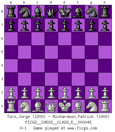 Last move : 0-1 2007 May 27 5:13:18 [Event "FICGS__CHESS__CLASS_E__000045"] [Site "FICGS"] [Date "2007.04.17"] [Round "1"] [White "Toro,Jorge"] [Black "Richardson,Patrick"] [Result "0-1"] [WhiteElo "1200"] [BlackElo "1400"] 0-1 This chess game has been lost on time (started : 2007.04.17 0:54:25) Player Black won this chess game. Follow this game move after move (download)What would Chess be without silly mistakes ? (Kurt Richter) Die jungen Leute sollen verstehen, dass sie noch etwas von mir lernen können und müssen. (Viktor Kortschnoi) Aún deseo matar a Fischer. (Boris Spassky) Le jeu d'échecs est comme rejeté hors du temps. (Antoine de Saint-Exupéry) Creativity is allowing yourself to make mistakes. Art is knowing which ones to keep. (Scott Adams)