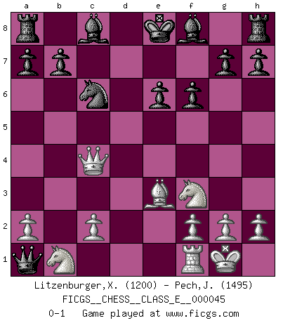 Last move : 0-1 2007 August 1 19:47:10 [Event "FICGS__CHESS__CLASS_E__000045"] [Site "FICGS"] [Date "2007.04.17"] [Round "1"] [White "Litzenburger,Xavier"] [Black "Pech,Jaroslav"] [Result "0-1"] [WhiteElo "1200"] [BlackElo "1495"] 1.e4 c5 2.d4 cxd4 3.Qxd4 Nc6 4.Qe3 Nf6 5.Bc4 e6 6.Nf3 Nxe4 7.Qxe4 d5 8.Qf4 dxc4 9.Ng5 Qf6 10.Qxc4 Qe5+ 11.Be3 f6 12.Nf3 Qxb2 13.O-O Qxa1 0-1 Sicilian : Smith-Morra gambit Kingside Castling by player White (move 13) Player Black won this chess game. Follow this game move after move (download)All Chess players should have a hobby. (Savielly Tartakower) Wenn ich gewinne bin ich ein Genie. Wenn nicht, dann bin ich keines. (Robert James Fischer) Siempre es mucho mejor sacrificar las piezas de tu oponente. (Savielly Tartakover) La conception d'un plan est le processus par lequel un joueur exploite les avantages de sa position tout en s'efforçant d'en réduire au minimum les inconvénients. Afin de garantir le succès, un plan doit toujours se fonder sur un diagnostic objectif des particularités d'une position. La conception d'un plan est d'autant plus difficile que la position est équilibrée, et grandement facilitée lorsqu'il n'existe qu'un seul plan susceptible de répondre aux exigences de la position. (Harry Golombek) Mandala - that's it! 16x16 squares as multiple of the four and the eight because of the Four Noble Truths and the Noble Eightfold Path. (Heinz-Georg Lehnhoff about Big Chess)
