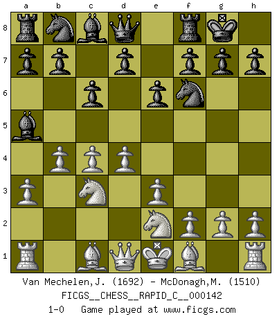 Last move : 1-0 2018 January 8 22:40:51 [Event "FICGS__CHESS__RAPID_C__000142"] [Site "FICGS"] [Date "2017.12.01"] [Round "1"] [White "Van Mechelen,Jan"] [Black "McDonagh,Michael"] [Result "1-0"] [WhiteElo "1692"] [BlackElo "1510"] 1.d4 Nf6 2.c4 e6 3.Nc3 Bb4 4.e3 O-O 5.Nge2 c6 6.a3 Ba5 7.b4 1-0 This chess game has been lost on time (started : 2017.12.01 15:25:47) Nimzo-Indian : 4.e3 O-O Kingside Castling by player Black (move 4) Player White won this chess game. Follow this game move after move (download)Via the squares on the chessboard, the Indians explain the movement of time and the age, the higher influences which control the world and the ties which link Chess with the human soul. (Al-Masudi) Die Partien sind immer verschieden, die Interviews immer die gleichen. (Garry Kasparov) El hombre es un frívolo, una creatura engañosa y como un jugador de Ajedrez, se preocupa mas por el proceso de obtener su meta que de la meta por sí misma. (Dostoyevsky) Les Echecs, c'est l'art de la guerre sans les charniers, c'est la résurrection des morts tombés au champ d'honneur, l'espoir perpétuel, la suprématie de l'intelligence sur la force, la culture de l'esprit. (F. Szpiner) It's unlucky to be superstitious. (Dave Enteles)
