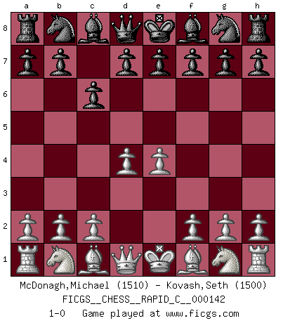 Last move : 1-0 2018 January 16 23:30:57 [Event "FICGS__CHESS__RAPID_C__000142"] [Site "FICGS"] [Date "2017.12.01"] [Round "1"] [White "McDonagh,Michael"] [Black "Kovash,Seth"] [Result "1-0"] [WhiteElo "1510"] [BlackElo "1500"] 1.e4 c6 2.d4 1-0 This chess game has been lost on time (started : 2017.12.01 15:25:47) Caro-Kann defense Player White won this chess game. Follow this game move after move (download)I know people who have all the will in the world, but still can't play good Chess. (Bobby Fischer) Ich habe die besten Aussichten, den ersten Preis zu gewinnen - denn jeder muss gegen Steinitz spielen, nur ich nicht! (Wilhelm Steinitz) Yo creo que el Ajedrez posee una magia que es también una ayuda en la edad avanzada. Una rodilla reumática es olvidada durante una partida de Ajedrez y otros eventos pueden parecer algo sin importancia comparada a una catástrofe en el tablero de Ajedrez. (Vlastimil Hort) Toutes choses étant égales, c'est la conviction qui gagne. Alliée à une volonté de vaincre, elle sert de détonateur, suscite des idées, disperse les doutes et aide à penser clairement. (Robert Fischer) Men should grow up. - Yeah. And dogs should stop licking themselves. It's not gonna happen. (Gregory House to Dr. Cameron, House M.D.)