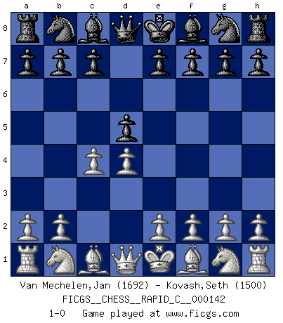 Last move : 1-0 2018 January 3 10:14:36 [Event "FICGS__CHESS__RAPID_C__000142"] [Site "FICGS"] [Date "2017.12.01"] [Round "1"] [White "Van Mechelen,Jan"] [Black "Kovash,Seth"] [Result "1-0"] [WhiteElo "1692"] [BlackElo "1500"] 1.d4 d5 2.c4 1-0 This chess game has been lost on time (started : 2017.12.01 15:25:47) Queen's Gambit Player White won this chess game. Follow this game move after move (download)Chess books should be used as we use glasses: to assist the sight, although some players make use of them as if they thought they conferred sight. (Jose Raul Capablanca) Wenn Du einsam bist, wenn Du Dich in der Welt wie ein Fremder fühlst, spiele Schach. Das wird Deinen Geist erheben und Dein Ratgeber im Kampf sein. (Aristoteles) Ayuda a tus piezas para que ellas te puedan ayudar. (Paul Morphy) La vérité est comme le meilleur coup aux échecs : elle existe, mais il faut la chercher. (Arturo Perez-Reverte) The quality of decision is like the well-timed swoop of a falcon which enables it to strike and destroy its victim. (Sun Tzu)