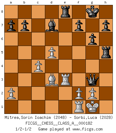 Last move : 1/2-1/2 2018 June 28 10:51:17 [Event "FICGS__CHESS__CLASS_A__000182"] [Site "FICGS"] [Date "2017.12.02"] [Round "1"] [White "Mitrea,Sorin Ioachim"] [Black "Sorbi,Luca"] [Result "1/2-1/2"] [WhiteElo "2048"] [BlackElo "2028"] 1.e4 e5 2.Nf3 Nf6 3.d4 Nxe4 4.Bd3 d5 5.Nxe5 Nd7 6.Nxd7 Bxd7 7.O-O Bd6 8.c4 c6 9.cxd5 cxd5 10.Nc3 Nxc3 11.bxc3 O-O 12.Qh5 g6 13.Qxd5 Qc7 14.c4 Bc6 15.Qg5 Bxh2+ 16.Kh1 Bd6 17.Bb2 Rae8 18.d5 Be5 19.Bxe5 Rxe5 20.Qg3 Bd7 21.Rae1 Rfe8 22.Re3 Rh5+ 23.Kg1 Qxg3 1/2-1/2 Petrov : Modern attack, Symmetrical variation Kingside Castling by player White (move 7) Kingside Castling by player Black (move 11) This chess game ended in a draw. Follow this game move after move (download)The chessboard is the world, the pieces are the phenomena of the Universe, the rules of the game are what we call the laws of Nature and the player on the other side is hidden from us. (Thomas Huxley) Sehr viele beherrschen heutzutage das große Einmalseins des Schachspiels und kennen sogar dessen Logarithmentafeln auswendig - deshalb sollte man hin und wieder zu beweisen trachten, dass zwei mal zwei auch fünf sein kann. (Mikhail Nekhemyevich Tal) El Ajedrez es tan inspirador que yo no creo que un buen jugador sea capaz de tener un pensamiento malo durante una partida. (Wilhelm Steinitz) Le joueur d'Echecs qui veut atteindre le top est obligé de développer son propre credo créatif. Alexeï Stepanovicth Souétine. Il est facile d'écrire des livres ! Ce qui est difficile, c'est de jouer ! (Alexeï Stepanovicth Souétine) It's not the size of the dog in the fight, it's the size of the fight in the dog. (Mark Twain)