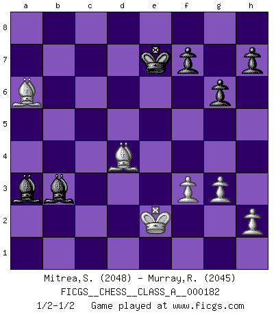 Last move : 1/2-1/2 2018 August 21 19:14:35 [Event "FICGS__CHESS__CLASS_A__000182"] [Site "FICGS"] [Date "2017.12.02"] [Round "1"] [White "Mitrea,Sorin Ioachim"] [Black "Murray,Russell"] [Result "1/2-1/2"] [WhiteElo "2048"] [BlackElo "2045"] 1.e4 e5 2.Nf3 Nf6 3.d4 Nxe4 4.Bd3 d5 5.Nxe5 Nd7 6.Nxd7 Bxd7 7.O-O Bd6 8.c4 c6 9.cxd5 cxd5 10.Nc3 Nxc3 11.bxc3 O-O 12.Qh5 g6 13.Qxd5 Qc7 14.g3 Be6 15.Qf3 Qxc3 16.Rb1 Qxd4 17.Be4 Qc4 18.Bxb7 Rad8 19.Bg5 Bg4 20.Qf6 Rfe8 21.Rbc1 Qd3 22.Rfe1 Bb4 23.Rxe8+ Rxe8 24.Ba6 Qf3 25.Qxf3 Bxf3 26.Be3 Re7 27.Bd4 Re8 28.Bxa7 Bd5 29.a4 Ra8 30.Rc8+ Rxc8 31.Bxc8 Bc6 32.Bb6 Bxa4 33.Kf1 Bb3 34.Ke2 Ba3 35.Ba6 Kf8 36.f3 Ke7 37.Bd4 1/2-1/2 Petrov : Modern attack, Symmetrical variation Kingside Castling by player White (move 7) Kingside Castling by player Black (move 11) This chess game ended in a draw. Follow this game move after move (download)Chess, like love, like music, has the power to make people happy. (Siegbert Tarrasch) Heutzutage gewinnt im Turnier nicht derjenige Spieler, der weitreichende Pläne entwirft, sondern einfach jener, der Zug um Zug kämpft. (David Bronstein) Fischer es el jugador mas fuerte del mundo. De hecho, el jugador mas fuerte que jamas haya existido. (Larry Evans) Les échecs, c'est l'art d'analyser. (Mikhail Botvinnik) Live, lose, and learn, by observing your opponent how to win. (Amber Steenbock)