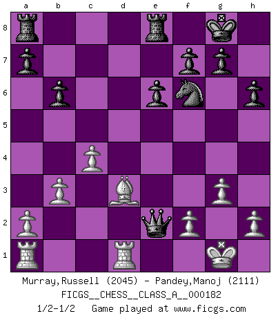 Last move : 1/2-1/2 2018 July 29 11:47:18 [Event "FICGS__CHESS__CLASS_A__000182"] [Site "FICGS"] [Date "2017.12.02"] [Round "1"] [White "Murray,Russell"] [Black "Pandey,Manoj"] [Result "1/2-1/2"] [WhiteElo "2045"] [BlackElo "2111"] 1.d4 Nf6 2.Nf3 e6 3.e3 d5 4.Bd3 c5 5.b3 b6 6.O-O Bb7 7.Bb2 Be7 8.dxc5 Bxc5 9.Nbd2 O-O 10.c4 Nc6 11.Qe2 Re8 12.Rfd1 d4 13.Nxd4 Nxd4 14.Bxd4 Bxd4 15.exd4 Qxd4 16.Nf3 Bxf3 17.Qxf3 Qb2 18.g3 h6 19.Rdb1 Qd4 20.Rd1 Qb2 21.Qe2 Qxe2 1/2-1/2 Queen's pawn : Yusupov-Rubinstein system Kingside Castling by player White (move 6) Kingside Castling by player Black (move 9) This chess game ended in a draw. Follow this game move after move (download)As one by one I mowed them down, my superiority soon became apparent. (Jose Capablanca) Jeder Fehler erscheint unglaublich dumm, wenn andre ihn begehen. (Georg Christoph Lichtenberg) El Ajedrez es el arte del análisis. (Mikhail Botvinnik) Votre prénom est 'Tactique', votre deuxième prénom est 'Tactique' et votre nom est 'Tactique'. (Ken Smith) The Internet is so big, so powerful and pointless that for some people it is a complete substitute for life. (Andrew Brown)