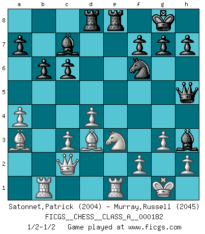 Last move : 1/2-1/2 2018 July 20 15:56:19 [Event "FICGS__CHESS__CLASS_A__000182"] [Site "FICGS"] [Date "2017.12.02"] [Round "1"] [White "Satonnet,Patrick"] [Black "Murray,Russell"] [Result "1/2-1/2"] [WhiteElo "2004"] [BlackElo "2045"] 1.e4 e5 2.Nf3 Nf6 3.Nxe5 d6 4.Nc4 Nxe4 5.d4 d5 6.Ne3 Qf6 7.Bb5+ c6 8.O-O Be6 9.Be2 Nd7 10.a4 Bd6 11.c4 dxc4 12.Nc3 Nxc3 13.bxc3 O-O 14.Nxc4 Bc7 15.Rb1 b6 16.Ne3 Rfe8 17.Bd3 Rad8 18.Qc2 Qh6 19.g3 Bh3 20.Re1 Nf6 21.Ba3 Qh5 22.Be2 Qg5 23.Bd3 Qh5 24.Be2 Qg6 25.Bd3 Qh5 1/2-1/2 Petrov : Paulsen attack Kingside Castling by player White (move 8) Kingside Castling by player Black (move 13) This chess game ended in a draw. Follow this game move after move (download)Becoming successful at Chess allows you to discover your own personality. That's what I want for the kids I teach. (Saudin Robovic) Es hat in meinem Leben Zeiten gegeben, in denen das Schachspiel, wenn nicht zum Lebenszweck, so doch zu einem regelrechten Lebensersatz geworden ist. Man fühlt sich in solchen Zeiten nicht so, als besäße man eine göttliche Gabe, sondern eher so, als sei man von ihr besessen. (Garry Kasparov) La estratégia requiere pensar, la táctica requiere observación. (Max Euwe) Karpov est une pièce de musée. (Garry Kasparov) Luck is what you have left over after you give 100 percent. (Langston Coleman)