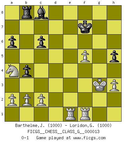 Last move : 0-1 2007 September 26 22:6:39 [Event "FICGS__CHESS__CLASS_G__000013"] [Site "FICGS"] [Date "2007.04.17"] [Round "1"] [White "Barthelme,Jean Eudes"] [Black "Loridon,Gabrielle"] [Result "0-1"] [WhiteElo "1000"] [BlackElo "1000"] 1.e4 e5 2.Nc3 Nh6 3.Nf3 Nc6 4.Bc4 g6 5.d3 Ng4 6.h3 Nf6 7.Ng5 Nh5 8.Nxf7 a6 9.Nxd8 Bd6 10.Nf7 Rf8 11.Bh6 Rxf7 12.Bxf7+ Kxf7 13.Qf3+ Nf4 14.g3 Nd4 15.O-O b5 16.gxf4 Nxf3+ 17.Kg2 c6 18.Kxf3 exf4 19.Bxf4 Bxf4 20.Kxf4 Ke8 21.Kg3 b4 22.Na4 d5 23.f4 dxe4 24.dxe4 Rb8 25.Rae1 h5 26.f5 gxf5 27.exf5 Kf7 0-1 Vienna game Kingside Castling by player White (move 15) Player Black won this chess game. Follow this game move after move (download)Capture of the adverse King is the ultimate but not the first object of the game. (William Steinitz) Schach ist Krieg, im Schach geht es um testosterongesteuerte Urschreie. (Garry Kasparov) La vida es como un juego de Ajedrez, cambiando con cada movimiento. (Proverbio Chino) RxDa4 pat (...) Every vice is only an exaggeration of a necessary and virtuous function. (Ralph Waldo Emerson, Journals 1936)