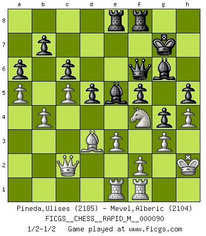 Last move : 1/2-1/2 2018 March 14 19:1:45 [Event "FICGS__CHESS__RAPID_M__000090"] [Site "FICGS"] [Date "2017.12.02"] [Round "1"] [White "Pineda,Ulises"] [Black "Mevel,Alberic"] [Result "1/2-1/2"] [WhiteElo "2185"] [BlackElo "2104"] 1.d4 d5 2.c4 e6 3.Nf3 c6 4.e3 Bd6 5.Nbd2 f5 6.c5 Bc7 7.b4 Nf6 8.a4 O-O 9.Be2 Ne4 10.Bb2 Nd7 11.O-O Qf6 12.a5 a6 13.g3 h5 14.Kg2 g5 15.h4 g4 16.Ne1 e5 17.Rc1 Qe7 18.dxe5 Nxe5 19.Nd3 Nxd2 20.Qxd2 Nc4 21.Qc3 Nxb2 22.Qxb2 Be6 23.Nf4 Bf7 24.Rce1 Rae8 25.Kg1 Be5 26.Qb1 Qf6 27.Bd3 Bg6 28.Qc2 Kg7 29.Kh2 1/2-1/2 Queen's gambit declined Kingside Castling by player Black (move 8) Kingside Castling by player White (move 11) This chess game ended in a draw. Follow this game move after move (download)Not only will I predict his triumph over Botvinnik, but I'll go further and say that he'll probably be the greatest Chess player that ever lived. (John Collins) Kann Schach nicht schließlich das Nationalspiel der Deutschen werden? Und welche weiteren Ausblicke bieten sich dann dar! Welche Hebung des allgemeinen Kultur-Niveaus, ja der Moral, wenn das Schachbrett den Kartentisch verdrängen würde! Wahrlich, ein Ziel, des Schweißes der Edlen wert! (Siegbert Tarrasch) Una mala movida nulifica cuarenta buenas. (Horowitz) Que feriez-vous si vous étiez en train de jouer aux échecs et que la fin du monde arrive ? Je continuerais à jouer. (Saint Borromée) 'preceded by its own quotation yields a falsehood' preceded by its own quotation yields a falsehood. (W. V. O. Quine - Set Theory And Its Logic, 1953)