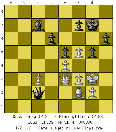 Last move : 1/2-1/2 2018 March 24 11:46:29 [Event "FICGS__CHESS__RAPID_M__000090"] [Site "FICGS"] [Date "2017.12.02"] [Round "1"] [White "Dusk,Jerzy"] [Black "Pineda,Ulises"] [Result "1/2-1/2"] [WhiteElo "2134"] [BlackElo "2185"] 1.e4 e5 2.Nf3 Nc6 3.Bb5 a6 4.Ba4 Nf6 5.O-O Be7 6.Re1 b5 7.Bb3 d6 8.c3 O-O 9.h3 Bb7 10.d4 Re8 11.Nbd2 Bf8 12.d5 Nb8 13.Nf1 Nbd7 14.Bg5 h6 15.Bh4 Be7 16.a4 g6 17.Qe2 c6 18.dxc6 Bxc6 19.Ne3 Nc5 20.axb5 Bxb5 21.Qd1 g5 22.Nf5 Bf8 23.Bg3 Nxb3 24.Qxb3 Bd7 25.Qc2 a5 26.Ne3 a4 27.Nh2 Qb6 28.Nhg4 Nxg4 29.hxg4 Reb8 30.Re2 Qc6 31.Ra3 Rb7 32.f3 Rab8 33.Ra2 Rb3 34.Qd1 Be6 35.Rc2 Be7 36.Bf2 Bd8 37.Rd2 Bc7 38.Qe2 a3 39.Rxa3 Rxa3 40.bxa3 Qa4 41.Rb2 Qxa3 42.Rxb8+ Bxb8 43.Qd2 Bc7 44.Nf5 Kh7 45.Kh2 Qa2 46.Qe3 Qb2 47.Kg3 Qb3 48.Kh3 Qb1 49.Kh2 Qc2 50.Kg3 Bxf5 51.gxf5 Kg7 1/2-1/2 Ruy Lopez : Closed Kingside Castling by player White (move 5) Kingside Castling by player Black (move 8) This chess game ended in a draw. Follow this game move after move (download)The game of chess is the touchstone of the intellect. (Goethe) Meine Liebe ist Schach, Schach, Schach. Ich muss jeden Tag Schach spielen, deshalb fühle ich mich so stark. (Miguel Najdorf) Sin errores no puede haber brillantez. (Emanuel Lasker) La guerre est enfant de la passion, la passion est enfant du narcissisme et le narcissisme est l'enfant. (...) Une autre partie ? (Thibault de Vassal) The arrogant army will lose certainly the battle. (Chinese proverb)