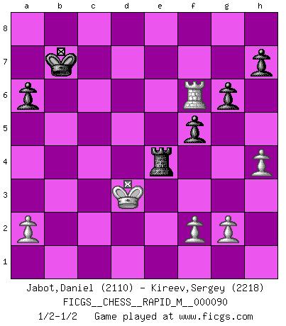 Last move : 1/2-1/2 2018 February 11 19:42:51 [Event "FICGS__CHESS__RAPID_M__000090"] [Site "FICGS"] [Date "2017.12.02"] [Round "1"] [White "Jabot,Daniel"] [Black "Kireev,Sergey"] [Result "1/2-1/2"] [WhiteElo "2110"] [BlackElo "2218"] 1.e4 c5 2.Nf3 Nc6 3.d4 cxd4 4.Nxd4 Nf6 5.Nc3 a6 6.Bg5 e6 7.Nxc6 bxc6 8.e5 Qa5 9.Qd4 Nd5 10.Bd2 Nb4 11.Qe4 Rb8 12.Bc4 d5 13.exd6 f5 14.Qe2 Nxc2+ 15.Kd1 Rxb2 16.Bc1 Qxc3 17.Bxb2 Qxb2 18.Rc1 Bxd6 19.Bxe6 Kd8 20.Bxc8 Re8 21.Qxc2 Qd4+ 22.Qd2 Qxd2+ 23.Kxd2 Bf4+ 24.Kd3 Bxc1 25.Rxc1 Kxc8 26.Rxc6+ Kb7 27.Rd6 Re7 28.h4 g6 29.Rf6 Re4 1/2-1/2 Sicilian defense This chess game ended in a draw. Follow this game move after move (download)Chess is imagination. (David Bronstein) Am wohlsten fühle ich mich, wenn ich sehe, wie sich mein Gegner im Todeskampf windet. (Robert James Fischer) Bobby es el jugador de Ajedrez mas fino que este país jamás haya producido. Su memoria para las movidas, su brillantez en soñar combinaciones y su feróz determinación por la victoria son algo extraño. (John Collins) Avant la finale, les dieux ont créé le milieu de partie. (Tarrasch) The Internet is the world's largest library. It's just that all the books are on the floor. (John Allen Paulos)