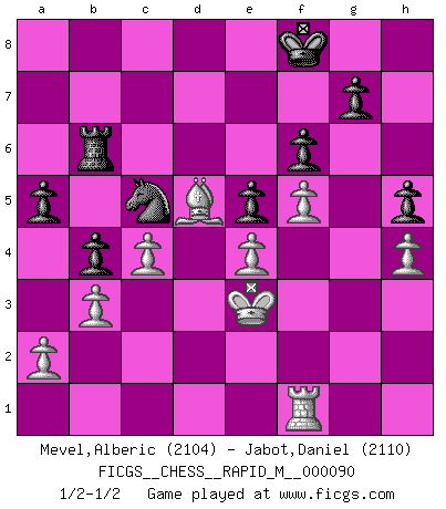 Last move : 1/2-1/2 2018 April 27 22:57:5 [Event "FICGS__CHESS__RAPID_M__000090"] [Site "FICGS"] [Date "2017.12.02"] [Round "1"] [White "Mevel,Alberic"] [Black "Jabot,Daniel"] [Result "1/2-1/2"] [WhiteElo "2104"] [BlackElo "2110"] 1.e4 c5 2.Nf3 d6 3.d4 cxd4 4.Nxd4 Nf6 5.Nc3 a6 6.Be3 e6 7.f3 b5 8.g4 h6 9.Qd2 b4 10.Na4 Nbd7 11.O-O-O Ne5 12.b3 Bd7 13.Nb2 d5 14.Bf4 Qc7 15.h4 dxe4 16.Nc4 Nxc4 17.Bxc4 e5 18.Bh2 Qc5 19.Nf5 Bxf5 20.gxf5 Be7 21.fxe4 Rd8 22.Qg2 O-O 23.Kb1 Rxd1+ 24.Rxd1 Rd8 25.Rg1 Ne8 26.Bg3 Qc7 27.Qe2 Nf6 28.Bf2 Qc6 29.Bd3 h5 30.Be3 Bc5 31.Rg2 Ng4 32.Bc1 Rd4 33.Bb2 Rd8 34.Bc1 Bd4 35.Bd2 a5 36.Rg3 Bc3 37.Bg5 Rd6 38.Bc4 Qb6 39.Bd5 Qf2 40.Qxf2 Nxf2 41.Kc1 Ng4 42.Bd2 Bxd2+ 43.Kxd2 Nf6 44.Rd3 Kf8 45.c4 Nd7 46.Ke3 Nc5 47.Rd1 f6 48.Rg1 Rb6 49.Rb1 Rd6 50.Rf1 Rb6 1/2-1/2 Sicilian : Najdorf, Byrne (English) attack Queenside Castling by player White (move 11) Kingside Castling by player Black (move 22) This chess game ended in a draw. Follow this game move after move (download)The beauty of a move lies not in its' appearance but in the thought behind it. (Siegbert Tarrasch) Auf jeden Fall musst du zuerst Rechtsanwalt werden, damit du deine eigenen Interessen und die deiner Familie vertreten kannst. [Brief an seinen Sohn] (José Raúl Capablanca) Si el ingenio solamente fuese necesario para lucirse, las mujeres serían las mejores jugadoras de Ajedrez del mundo. (Albin) Seul un grand joueur sait à quel point il joue faiblement. (Xavier Tartacover) Being number two sucks. (Andre Agassi)