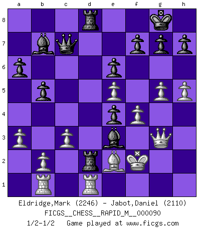 Last move : 1/2-1/2 2018 February 15 23:46:59 [Event "FICGS__CHESS__RAPID_M__000090"] [Site "FICGS"] [Date "2017.12.02"] [Round "1"] [White "Eldridge,Mark"] [Black "Jabot,Daniel"] [Result "1/2-1/2"] [WhiteElo "2246"] [BlackElo "2110"] 1.e4 c5 2.Nf3 d6 3.d4 cxd4 4.Nxd4 Nf6 5.Nc3 a6 6.Be3 e6 7.Be2 Be7 8.f4 Qc7 9.O-O O-O 10.g4 d5 11.e5 Ne4 12.Nxe4 dxe4 13.Rc1 b6 14.Qe1 Nc6 15.c3 Bb7 16.h4 b5 17.h5 Rac8 18.Nb3 Na5 19.Qg3 Rfd8 20.Nxa5 Qxa5 21.a3 Qc7 22.g5 Bc5 23.Kf2 Rd2 24.Rb1 Rcd8 25.Rfd1 Bxe3+ 1/2-1/2 Sicilian : Najdorf, Byrne (English) attack Kingside Castling by player White (move 9) Kingside Castling by player Black (move 9) This chess game ended in a draw. Follow this game move after move (download)Chess is really ninety nine percent calculation. (Soltis) Jeder Schachmeister war einmal ein Anfänger. (Irving Chernev) La señal de un Gran Maestro es su habilidad de ganar una partida rápidamente y sin dolor. (Irving Chernev) Le système Elo représente seulement une moyenne. Il est simplement un indicateur de votre stabilité. (Anatoli Karpov) Philosophers use a language that is already deformed as though by shoes that are too tight. (Ludwig Wittgenstein)