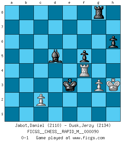 Last move : 0-1 2018 March 22 9:50:12 [Event "FICGS__CHESS__RAPID_M__000090"] [Site "FICGS"] [Date "2017.12.02"] [Round "1"] [White "Jabot,Daniel"] [Black "Dusk,Jerzy"] [Result "0-1"] [WhiteElo "2110"] [BlackElo "2134"] 1.e4 c5 2.Nf3 d6 3.d4 cxd4 4.Nxd4 Nf6 5.Nc3 a6 6.Bg5 e6 7.f4 h6 8.Bh4 Qb6 9.Qd2 Qxb2 10.Rb1 Qa3 11.e5 dxe5 12.fxe5 Nfd7 13.Ne4 Qxa2 14.Rd1 Qd5 15.Qe3 Qxe5 16.Be2 Bc5 17.Nxe6 Bxe3 18.Nd6+ Qxd6 19.Rxd6 g5 20.Bg3 Ke7 21.Nc7 Bf4 22.Rxd7+ Nxd7 23.Bxf4 gxf4 24.Nxa8 b5 25.Nc7 Kd6 26.Nxb5+ axb5 27.Bxb5 Nf6 28.O-O Ke5 29.g3 fxg3 30.hxg3 Rg8 31.Kh2 Be6 32.Bd3 Ne4 33.Bxe4 Kxe4 34.Rf4+ Ke3 35.Kg2 Bd5+ 36.Kh3 f5 0-1 Sicilian : Najdorf, 7.f4 Kingside Castling by player White (move 28) 10 pieces endgame at move 33 : White KRBPP , Black KRBPP WHITE : King + 1 Rook 1 Bishop 2 Pawns BLACK : King + 1 Rook 1 Bishop 2 Pawns 9 pieces endgame at move 33 : White KRPP , Black KRBPP WHITE : King + 1 Rook 2 Pawns BLACK : King + 1 Rook 1 Bishop 2 Pawns Player Black won this chess game. Follow this game move after move (download)In Fischer's hands, a slight theoretical advantage is as good a being a Queen ahead. (Isaac Kashdan) Der Umstand, daß uns eine 7 Stunden Zeitkontrolle ermöglicht eine großartige, tiefe Partie zu spielen, ist für die Massenmedien nicht weiter von Bedeutung. (Alexej Shirov) Los errores estan ahí, esperando a que se cometan. (Savielly Tartakower) Ce qui est bien, c'est d'avoir tout un tas de pièces en prise : l'adversaire ne peut en prendre qu'une à la fois. Cité par Thierry Audin. Establishing goals is all right if you don't let them deprive you of interesting detours. (Doug Larson)