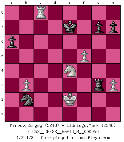 Last move : 1/2-1/2 2017 December 27 14:41:5 [Event "FICGS__CHESS__RAPID_M__000090"] [Site "FICGS"] [Date "2017.12.02"] [Round "1"] [White "Kireev,Sergey"] [Black "Eldridge,Mark"] [Result "1/2-1/2"] [WhiteElo "2218"] [BlackElo "2246"] 1.e4 c5 2.Nf3 d6 3.d4 cxd4 4.Nxd4 Nf6 5.Nc3 a6 6.Be3 e5 7.Nb3 Be6 8.h3 Be7 9.f4 Nc6 10.f5 Bxb3 11.axb3 Nb4 12.g3 d5 13.exd5 Qc7 14.d6 Bxd6 15.Nb5 Nxc2+ 16.Ke2 Qc6 17.Nxd6+ Ke7 18.Rc1 Nxe3 19.Rxc6 Nxd1 20.Nxb7 Rhb8 21.Rc7+ Kf8 22.Nd6 Nxb2 23.Bg2 e4 24.Rhc1 Rd8 25.Nxf7 Rd3 26.Ng5 Rxg3 27.Bxe4 Nxe4 28.Rc8+ Rxc8 29.Rxc8+ Ke7 30.Nxe4 1/2-1/2 Sicilian : Najdorf, Byrne (English) attack This chess game ended in a draw. Follow this game move after move (download)Chess is thirty to forty percent psychology. You don't have this when you play a computer. I can't confuse it. (Judith Polgar) Das Blackmar-Diemer-Gambit verändert den ganzen Menschen! (Emil Joseph Diemer) Me gusta decir que Bobby Fischer fue el mejor jugador que jamás haya existido. Pero lo que hizo de Fischer un genio, fue su habilidad de mezclar una frescura y pragmatismo Americano con ideas Rusas acerca de la estrategia. (Bruce Pandolfini) Toute estimation doit être constamment réévaluée. (Jacob Estrin) Animated gif is worth one mega-word. (Unknown)