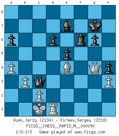Last move : 1/2-1/2 2017 December 7 15:36:56 [Event "FICGS__CHESS__RAPID_M__000090"] [Site "FICGS"] [Date "2017.12.02"] [Round "1"] [White "Dusk,Jerzy"] [Black "Kireev,Sergey"] [Result "1/2-1/2"] [WhiteElo "2134"] [BlackElo "2218"] 1.e4 c5 2.Nf3 d6 3.d4 cxd4 4.Nxd4 Nf6 5.Nc3 a6 6.Be3 e6 7.g4 e5 8.Nf5 g6 9.Bg2 gxf5 10.exf5 h5 11.g5 Ng4 12.Bd2 Bxf5 13.h3 Nxf2 14.Qf3 Nxh1 15.Qxf5 Nc6 16.Bxh1 Be7 17.Be3 Qd7 18.Qf1 Nd4 19.O-O-O Nf5 20.Qf2 Nxe3 21.Qxe3 h4 22.g6 fxg6 23.Nd5 Kf7 24.Nb6 Qd8 25.Qb3+ Kg7 26.Nxa8 Qxa8 27.Bxb7 Qa7 28.Be4 Rf8 29.Qe6 Rf6 30.Qg4 Qc7 31.a4 Qc4 32.b3 Qc3 1/2-1/2 Sicilian : Najdorf, Byrne (English) attack Queenside Castling by player White (move 19) This chess game ended in a draw. Follow this game move after move (download)During a Chess competition a Chessmaster should be a combination of a beast of prey and a monk. (Alexander Alekhine) Wenn man heute mit 14 Jahren noch kein GM ist, kann man es vergessen. (Viswanathan Anand) Por esta medida (el intervalo entre Fischer y sus contemporaneos), yo le considero el mas grande campeón mundial. (Garry Kasparov) Les sacrifices démontrent seulement que quelqu'un a gaffé. (Savielly Tartacover) Life is pleasant. Death is peaceful. It's the transition that's troublesome. (Isaac Asimov)