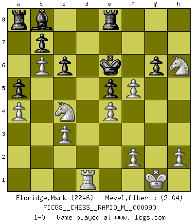 Last move : 1-0 2018 February 14 22:38:16 [Event "FICGS__CHESS__RAPID_M__000090"] [Site "FICGS"] [Date "2017.12.02"] [Round "1"] [White "Eldridge,Mark"] [Black "Mevel,Alberic"] [Result "1-0"] [WhiteElo "2246"] [BlackElo "2104"] 1.e4 e5 2.Nf3 Nc6 3.Bc4 Nf6 4.d3 Bc5 5.c3 O-O 6.O-O d6 7.b4 Bb6 8.a4 a5 9.b5 Ne7 10.Nbd2 Ng6 11.Bb3 c6 12.Nc4 Bc7 13.Re1 Re8 14.Bg5 h6 15.b6 Bb8 16.Bxf6 Qxf6 17.Rb1 Ra6 18.Ne3 Qd8 19.d4 Nf8 20.dxe5 dxe5 21.Bc4 Ra8 22.Qxd8 Rxd8 23.Red1 Nd7 24.Nh4 Kf8 25.Nhf5 Re8 26.Rxd7 Bxd7 27.Rd1 Be6 28.g4 g6 29.Nxh6 Ke7 30.Bxe6 Kxe6 31.Nc4 f5 32.gxf5+ 1-0 Two knights defense (Modern Bishop's Opening) Kingside Castling by player Black (move 5) Kingside Castling by player White (move 6) Player White won this chess game. Follow this game move after move (download)He who takes the Queen's Knight's Pawn will sleep in the streets. (Anonymous) Du weisst es gibt ein Problem mit Computern und Fernschach, wenn jeder eine Rating von 2450 hat. (John Christen Knudsen) Aquel que teme a un Peón de Reina aislado, debería de retirarse del Ajedrez. (Siegbert Tarrasch) Mais l'homme est une créature légère et illogique : semblable au joueur d'échecs, il n'aime que le processus du but à atteindre, non le but lui-même. (Dostoïevsky) It is not true that people stop pursuing dreams because they grow old, they grow old because they stop pursuing dreams. (Gabriel Garcia Marquez)