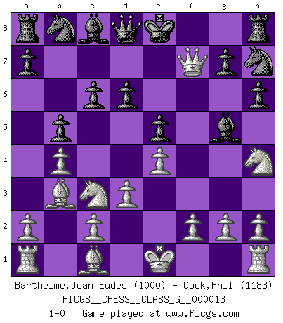 Last move : 1-0 2007 April 29 10:17:54 [Event "FICGS__CHESS__CLASS_G__000013"] [Site "FICGS"] [Date "2007.04.17"] [Round "1"] [White "Barthelme,Jean Eudes"] [Black "Cook,Phil"] [Result "1-0"] [WhiteElo "1000"] [BlackElo "1183"] 1.e4 e5 2.Nf3 Nf6 3.Nc3 d6 4.Bc4 h6 5.d3 c6 6.b4 b5 7.Bb3 Be7 8.Nh4 Nh7 9.Qh5 Bg5 10.Qxf7+ 1-0 Petrov Three knights game Player White won this chess game. Follow this game move after move (download)There is no remorse like the remorse of Chess. (H. G. Wells) Es gibt nur zwei wahre Schachgenies - das andere war Wilhelm Steinitz, der Weltmeister von 1872 bis 1894. (Robert James Fischer) Bobby Fischer es el jugador de Ajedrez mas grande que jamás haya existido. (Ken Smith) Le pion, dans sa simplicité, marche droit devant lui, mais lorsqu'il prend, il le fait obliquement? Ainsi l'homme, tant qu'il reste pauvre, marche dans la droiture et vit honnêtement, mais lorsqu'il recherche les honneurs, il flatte, se parjure et, par les voies obliques, cherche une position supérieure sur l'échiquier du monde. (Jean de Galles) Ah, the Socrating method. The best way we have of teaching everything-apart from juggling chainsaws. (Gregory House, House M.D.)