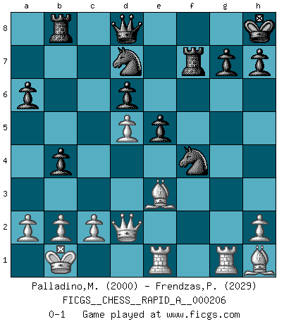 Last move : 0-1 2018 February 16 19:0:47 [Event "FICGS__CHESS__RAPID_A__000206"] [Site "FICGS"] [Date "2017.12.30"] [Round "1"] [White "Palladino,Mario"] [Black "Frendzas,Panayotis"] [Result "0-1"] [WhiteElo "2000"] [BlackElo "2029"] 1.e4 c5 2.Nf3 d6 3.d4 cxd4 4.Nxd4 Nf6 5.Nc3 a6 6.Be3 e5 7.Nb3 Be6 8.f3 Be7 9.Qd2 O-O 10.O-O-O Nbd7 11.g4 b5 12.g5 Nh5 13.Nd5 Bxd5 14.exd5 f6 15.gxf6 Bxf6 16.Na5 Qe8 17.Nb7 Be7 18.Rg1 Rxf3 19.Bg2 Rf6 20.Kb1 Nf4 21.Bf3 Rb8 22.Na5 Bd8 23.Nc6 Ra8 24.Nxd8 Qxd8 25.Rg4 Rf7 26.Re1 Kh8 27.Bh1 Rb8 28.R4g1 b4 0-1 Sicilian : Najdorf, Byrne (English) attack Kingside Castling by player Black (move 9) Queenside Castling by player White (move 10) Player Black won this chess game. Follow this game move after move (download)We must make sure that Chess will not be like a dead language, very interesting, but for a very small group. (Sytze Faber) Frage: Was machen Sie mit den Preisen? Anwort: Ich habe Angst, dass meine Freundin davon neue Kleider kauft. (Loek van Wely) Bobby es el jugador de Ajedrez mas fino que este país jamás haya producido. Su memoria para las movidas, su brillantez en soñar combinaciones y su feróz determinación por la victoria son algo extraño. (John Collins) Les erreurs sont comme les malheurs, elles n'arrivent jamais seules. (Siegbert Tarrasch) But they are useless. They can only give you answers. (Pablo Picasso, about computers)